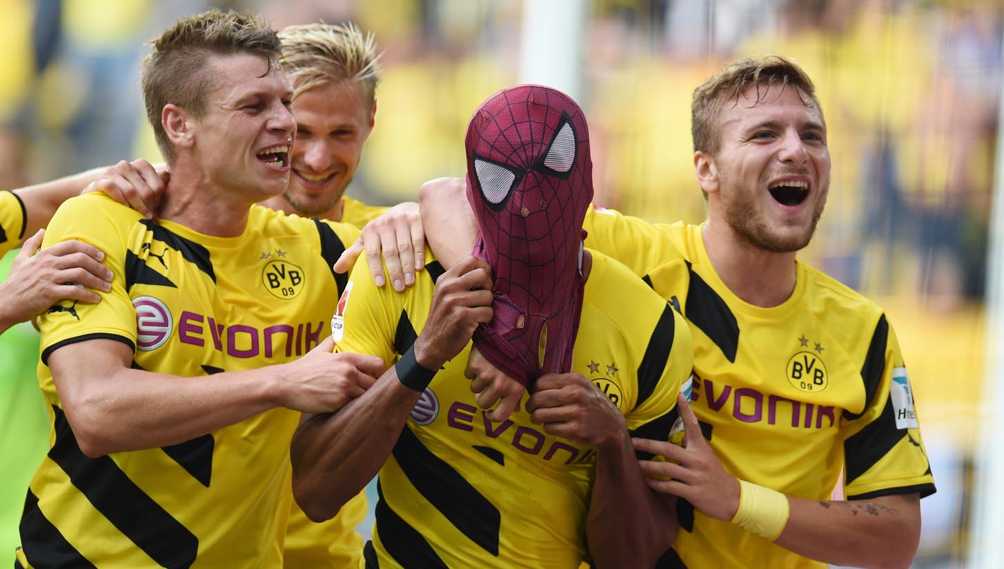 Aubameyang celebrating in a Spiderman mask against Bayern Munich in 2014.