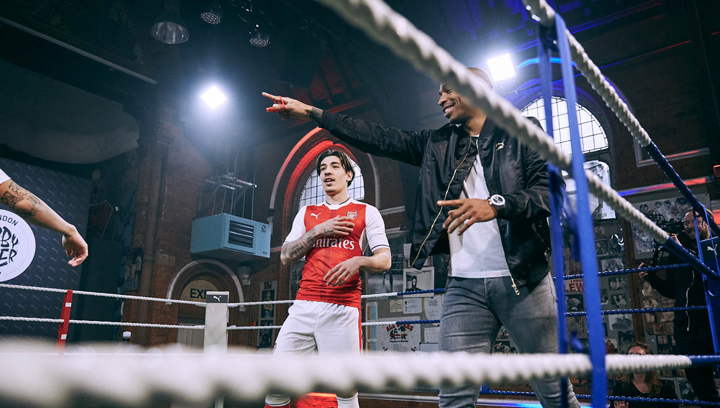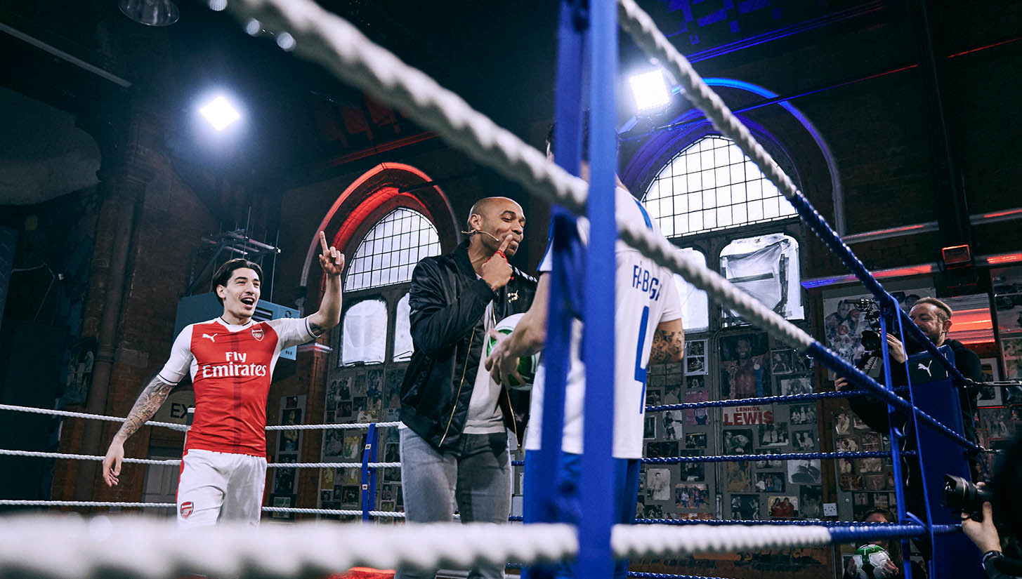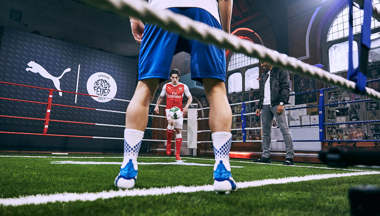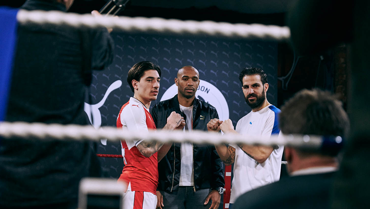 As a lunchtime kick off looms, Chelsea and Arsenal are preparing to go to battle and Stamford Bridge this weekend. A tenacious rivalry that sees two sides fight it out for three crucial points and the bragging rights over their claim of London, this goes further than any regular fixture. Turning up the heat in anticipation, PUMA took to one of London's meanest boxing clubs, dressed it in their style, re-turfed the ring and brought Hector Bellerin and Cesc Fabregas to go toe-to-toe. Looking on, the legendary figure of Thierry Henry played on the shoulder as these two took to the stage to go through round one as they each laced up their "Derby Fever" boots ahead of this weekends on pitch battle.