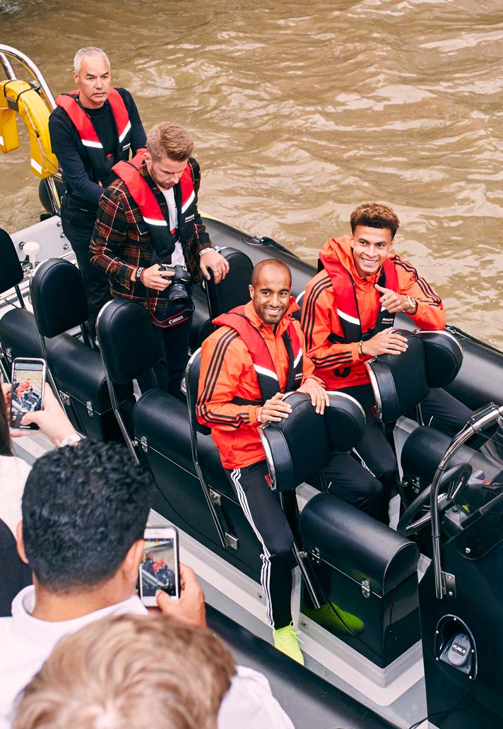 Overlooked by the iconic Tower Bridge as the sun set across the capital, adidas hosted a night of floating fire by inviting London's finest talent onto a barge of beats for a late summer showdown. Kicking things off with a Tango League tussle for ultimate bragging rights, before the arrival of Tottenham duo Dele Alli and Lucas Moura, and West Ham's Felipe Anderson and Javier Hernandez rocked up along the Thames in speed boats.