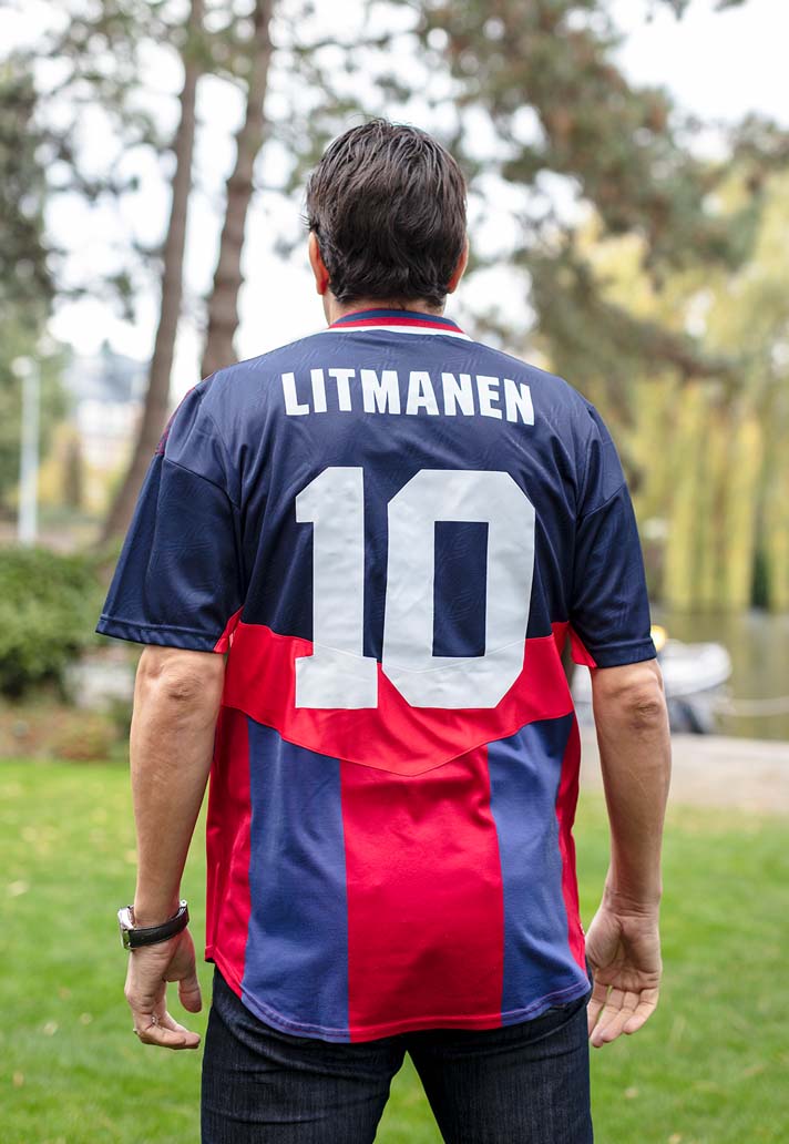 One of Finland’s greatest exports, Jari Litmanen, has been presented with a special career mash-up jersey, which combines shirts from the three biggest clubs that he played for.