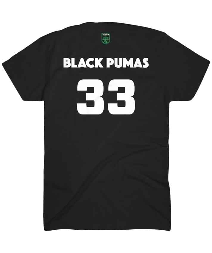 The shirts feature a mash-up of Black Pumas’ logo and the Austin FC crest. The number 33 adorns the back, a nod to the group’s song “OCT 33.” A portion of proceeds from each shirt sold will benefit the initiative which is devoted to preserving Austin music institutions through these difficult times until it is safe to open their doors once again.