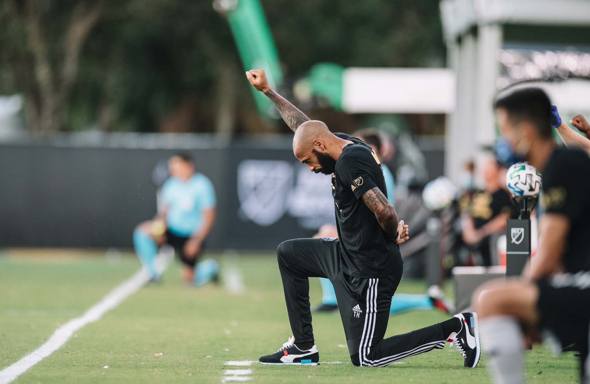 Montreal Impact manager Thierry Henry, wearing the Black Lives Matter Tee, made one of the most discreet, yet powerful gestures of solidarity BLM movement in the tournament so far during his side’s match against New England Revolution, taking a knee for the first eight minutes and 46 seconds of the contest. As one of two Black head coaches in MLS, Henry has been vocal about the need for reforms to address systemic racism in the wake of the George Floyd incident.