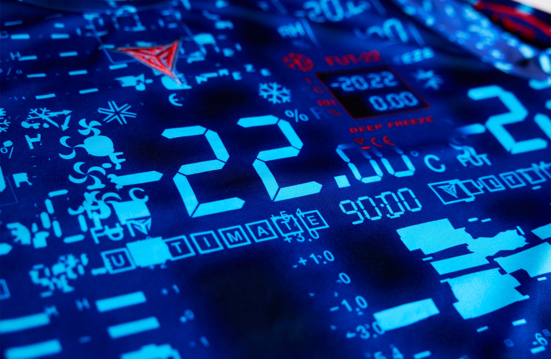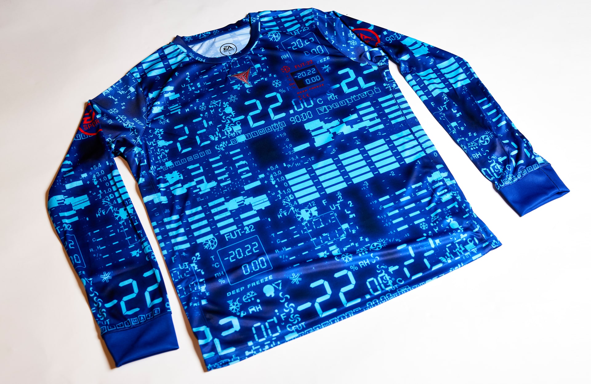 The away kit then incorporates the geometric pattern in a contrast white winter wonderland, while the goalkeeper kit is inspired by the graphically expressive kits of the 90s, with an allover pattern made up of the LCD readouts on refrigerators and freezers. That kit plays up the LCD graphics, as there's a tendency for the Keeper kits to be more expressive. And because the Keeper kits need to be clearly differentiated from the outfield kits, the red/orange base colour is used as a contrast of fire to ice. All three kits have an LCD readout in place of a traditional badge, as if the player is wearing an IoT garment.