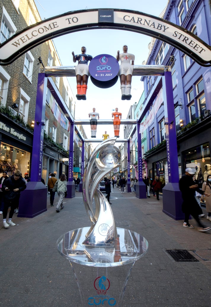 The installation, featuring nine feet tall women’s players representing the top-seeded team in each group (England, Germany, Netherlands and France) suspended five metres above Carnaby Street, celebrates the scale and importance of UEFA Women’s EURO 2022 by repurposing the traditionally male-dominated table football game. It will be present from 28 March to 10 April.