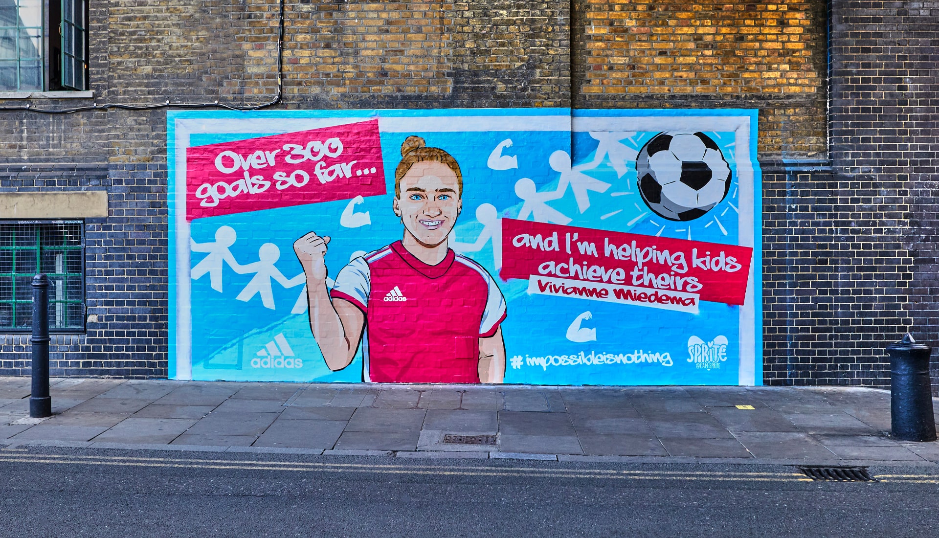 Revealed across London in Portobello Road (Mapi Leon), Nine Elms (Millia Bright), Shoreditch (Vivianne Miedema) and Peckham Rye (Wendie Renard), the Murals have been created in collaboration with female artists from the UK. Each mural features a design that visualises the player’s story, framed by their goals, and they are accompanied by short-films – further celebrating the goals that the players have achieved and continue to pursue both on and off the pitch.