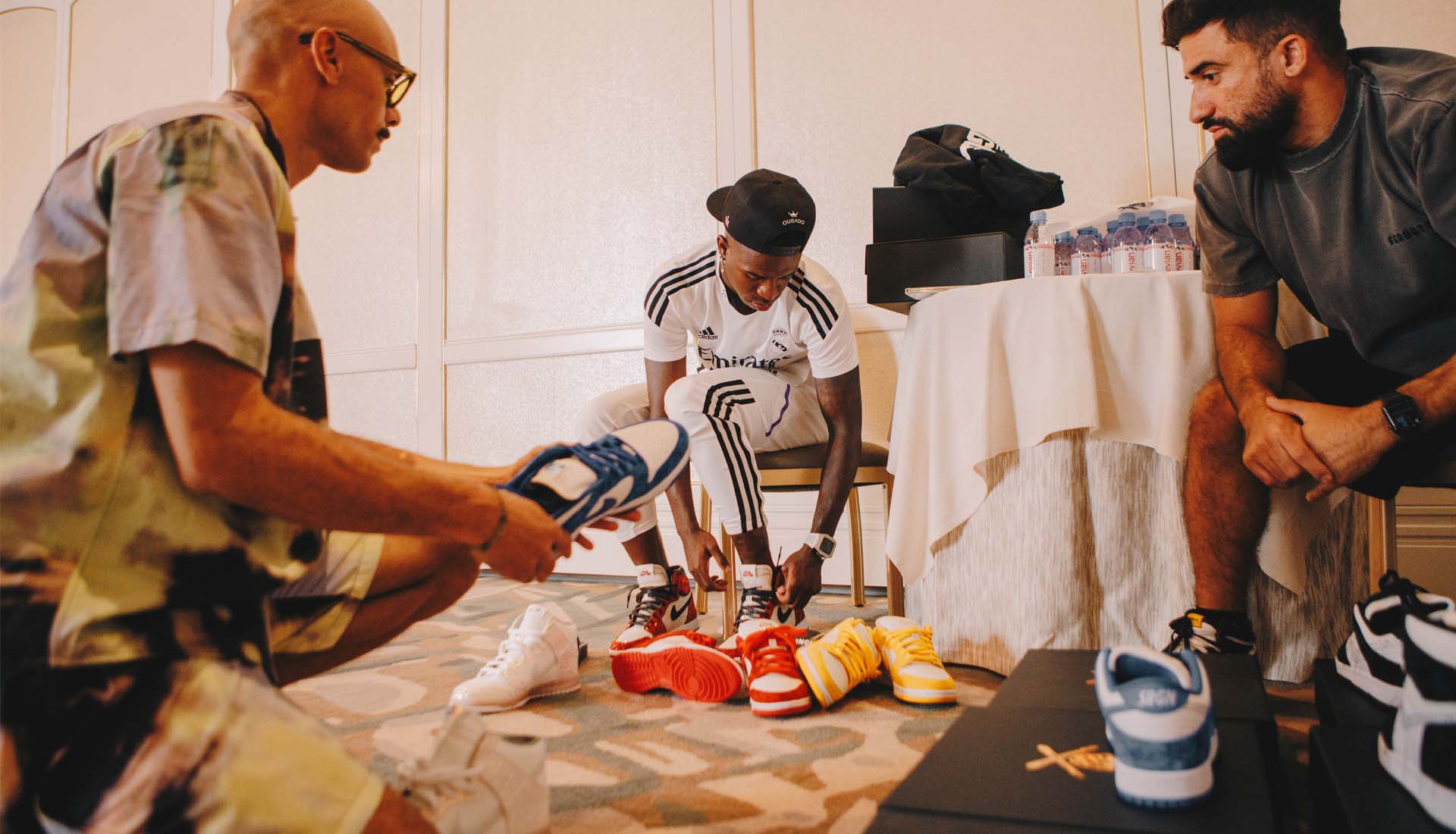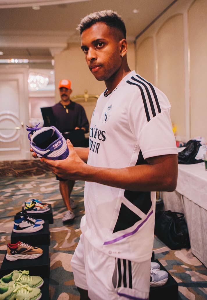 Dropping into the Real Madrid's Beverly Hills Hotel base for their pre-season tour of the United States, The Shoe Surgeon hooked up some of the squad with special edition pairs from his bespoke collection. Eduardo Camavinga and Vinicius Jr were unsurprisingly at the front of the queue to add some one-off pieces to their own respective sneaker collections that they regularly show off on their socials.