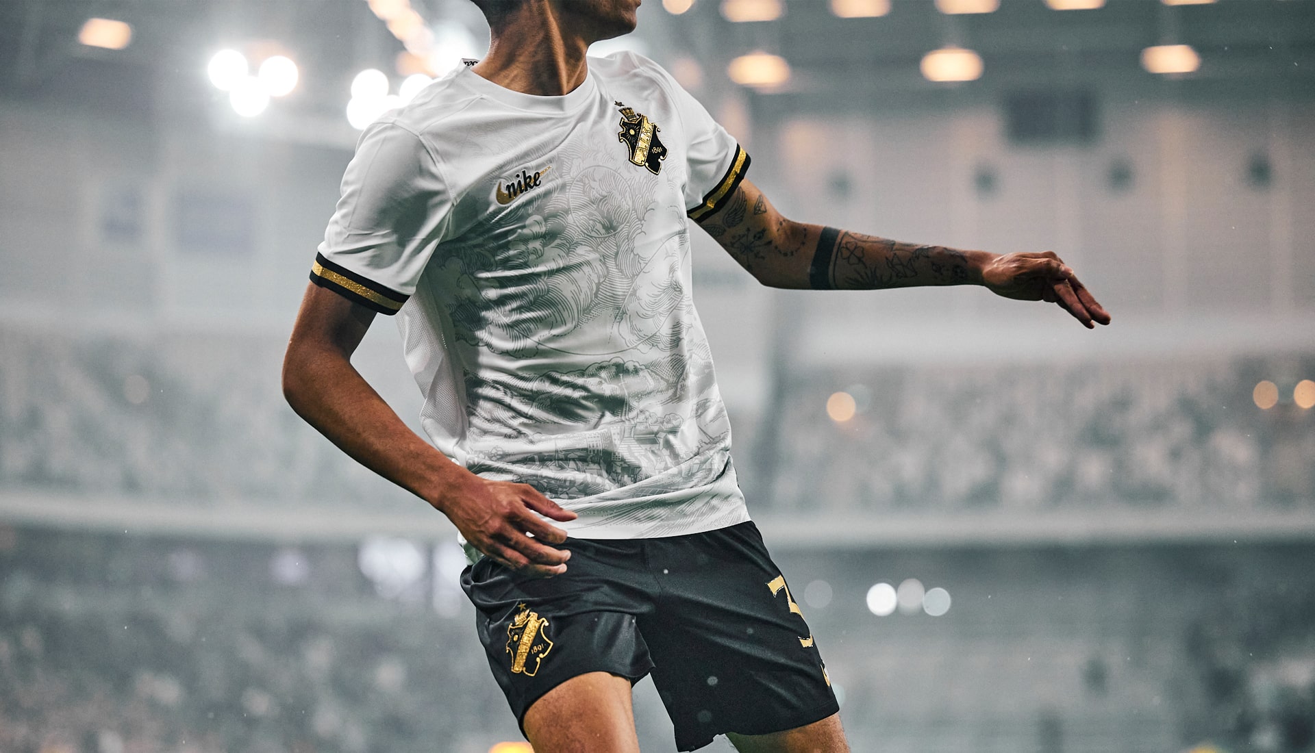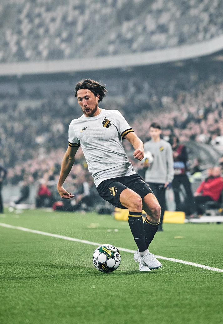 Produced together with partner Nike, the new kit pays tribute to the club’s home city, Stockholm. On the chest, there’s a pattern inspired by the Sun Table, an oil painting from the sixteenth century, which is one of the oldest known depictions of Stockholm. The raised marks on the shirt are handcrafted and made in 3D silicone to bring out the highest possible richness of detail, while the club badge also has a fabric base in black velvet. All the gold details on the shirt have been enriched with metal particles for a more prominent gold shimmer. There’s even that special execution of the brand logo, with the word “Nike” overlaid across the Swoosh, a move that seems to be reserved for AIK only in the footballing world.