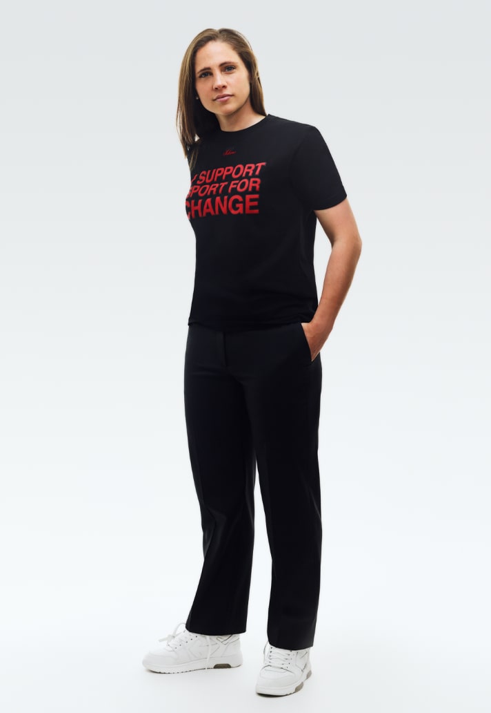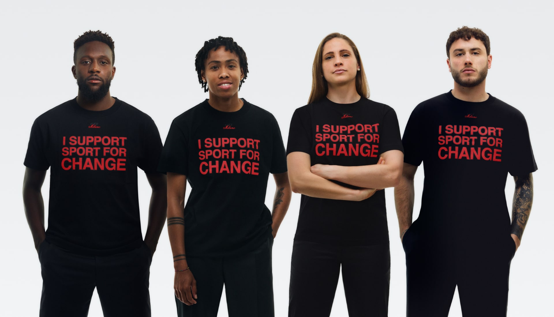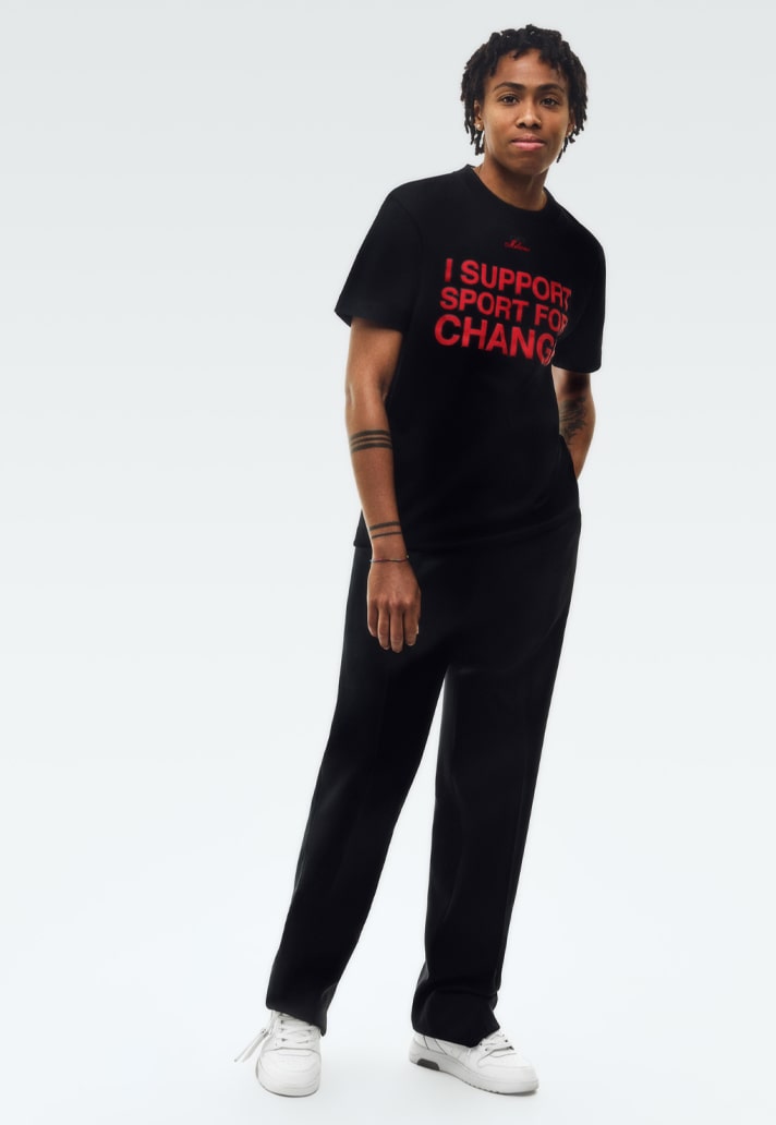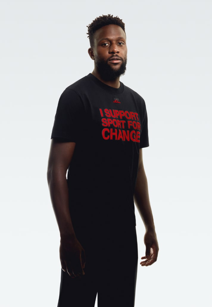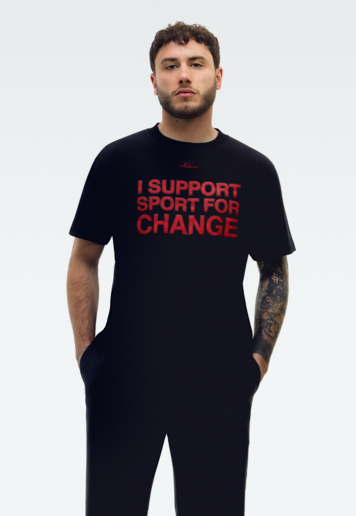 Black with red writing, the t-shirt declares “I SUPPORT SPORT FOR CHANGE” across its chest, with a hybrid AC Milan and Off-White logo under the center collar, the iconic AC Milan diavolo mascot on the back and all proceeds from the t-shirt’s sale returning to Fondazione Milan for their Sport For Change program.