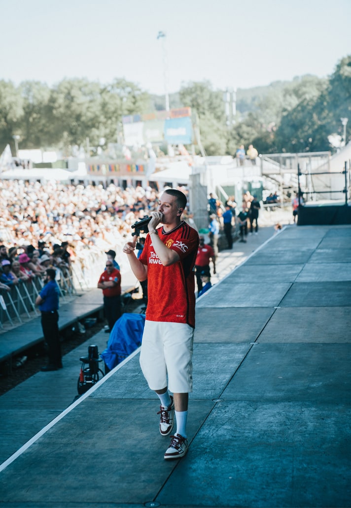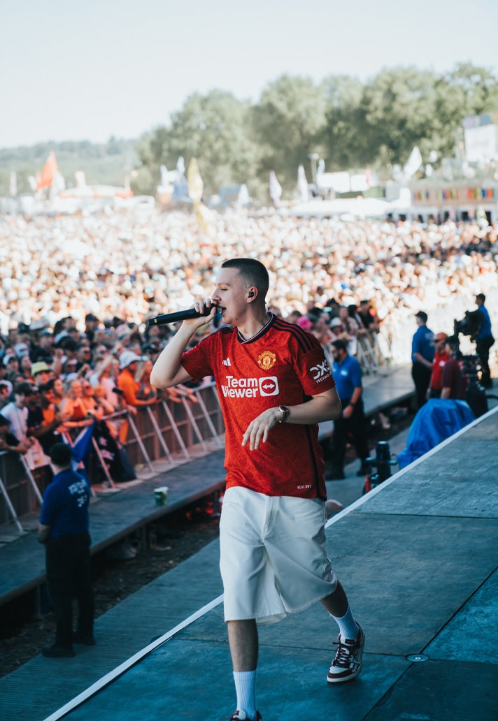 Coming a few days ahead of an expected official launch, Manchester rapper Aitch gave everyone at Glastonbury’s Pyramid Stage a first look at Man United’s 2023/24 adidas home shirt this weekend.
