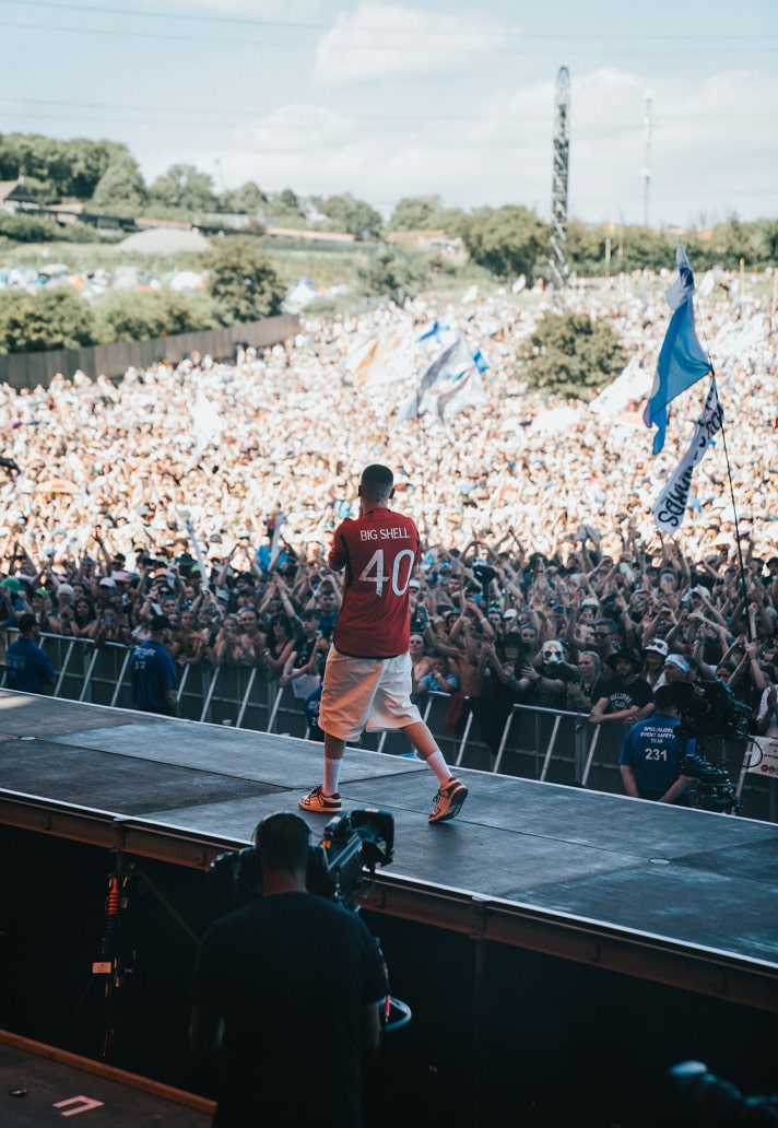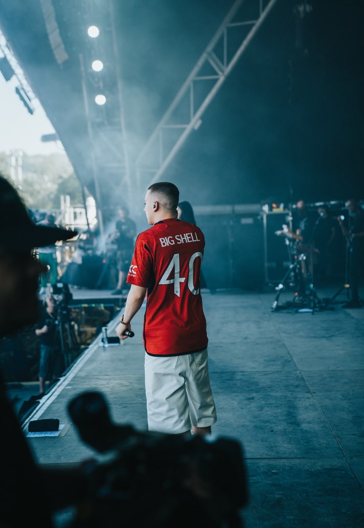 The 23-year-old, from the Manchester suburb of Moston, is a huge United fan, and he initially had the red shirt tucked into the waistband of his shorts, and it wasn't clear what it was. During a break between songs in his set, he spotted someone in the crowd wearing a Man City shirt and said: "You there, in the Man City top. You're not gonna like me after this.” He then produced the jersey, which had the name "Big Shell" and No. 40 on the back, and put it on, giving the world a first proper look at the new design.