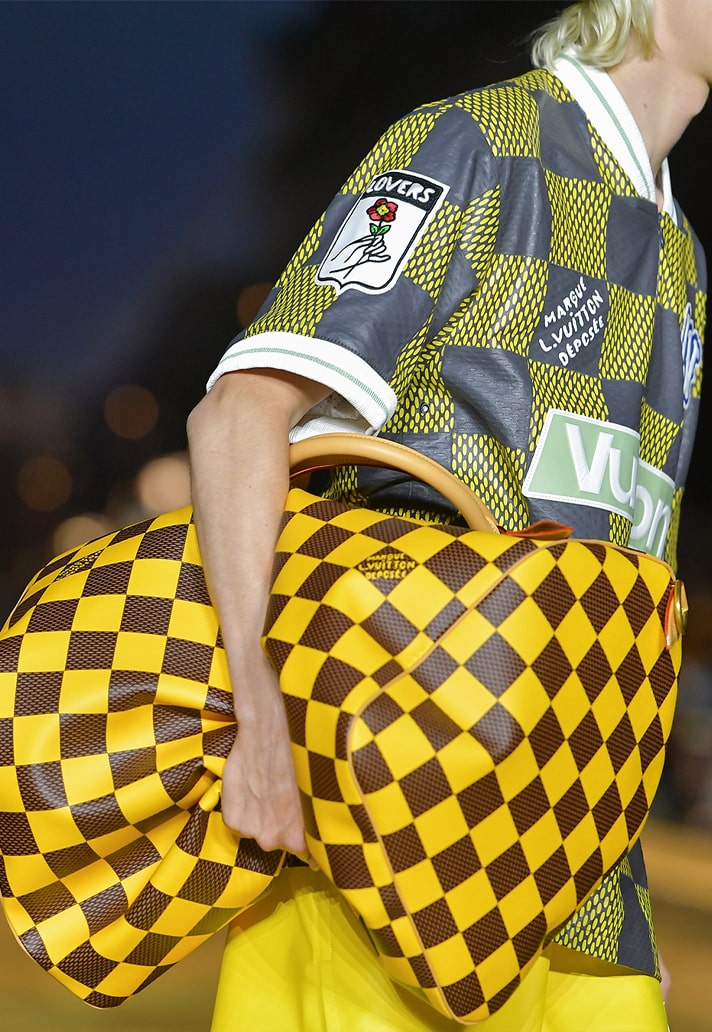 As for the show itself, Pharrell clearly hasn’t forgotten his links to football, and, having produced kits for some of Europe’s elite as part of his Humanrace x adidas hookup in the past, he once again includes a football shirt silhouette in this debut LV collection. The design utilises the luxury house’s iconic Damier print as a base, expanded to dominate the entire look.