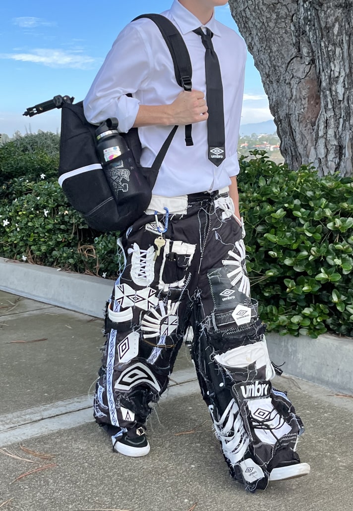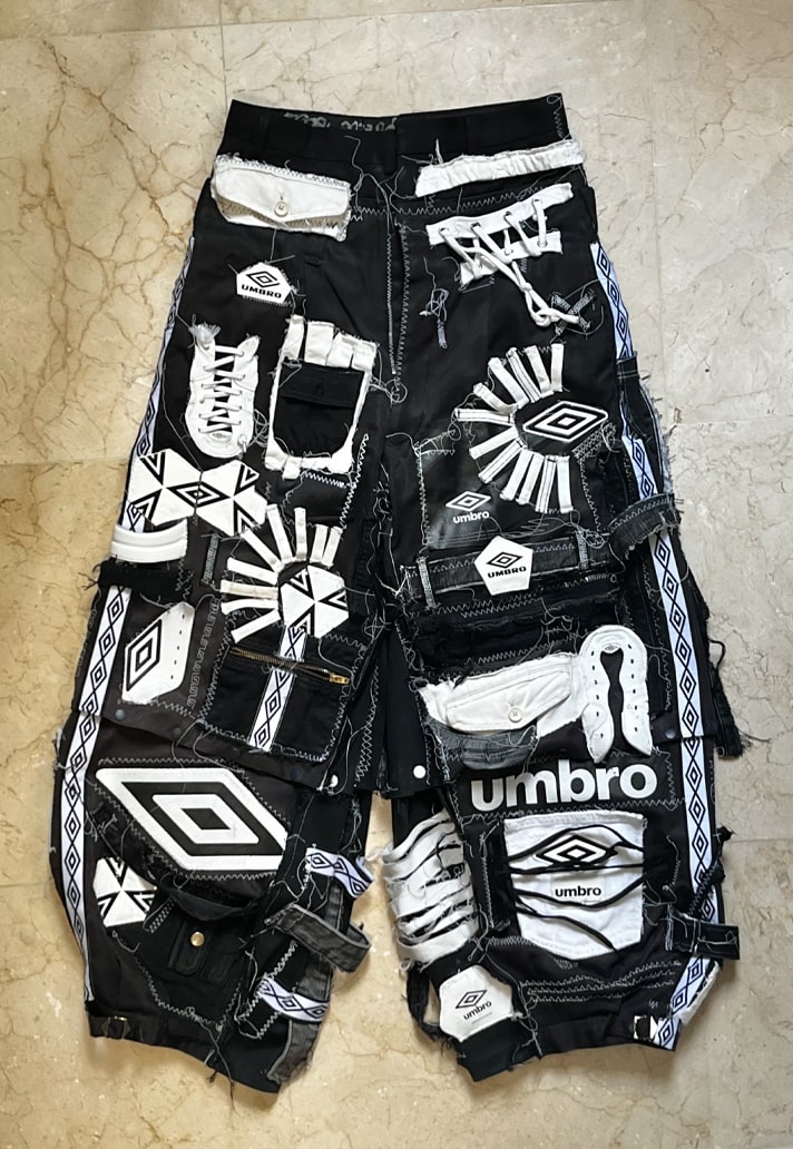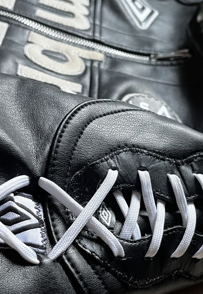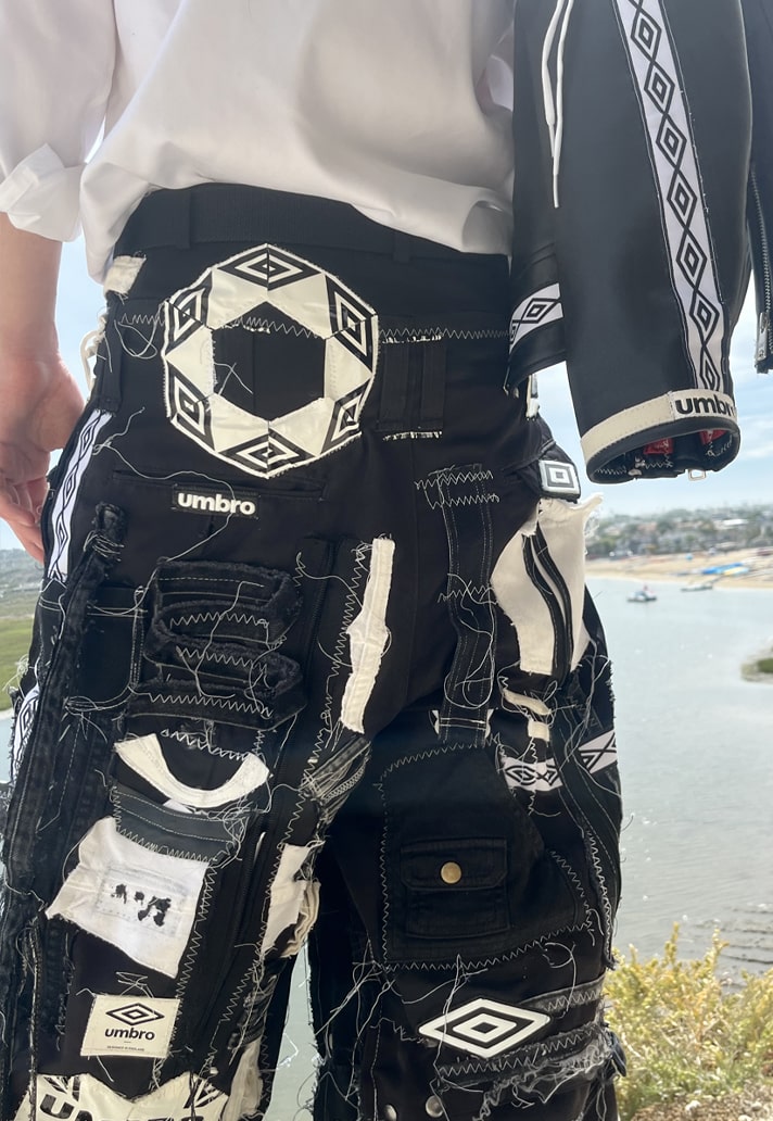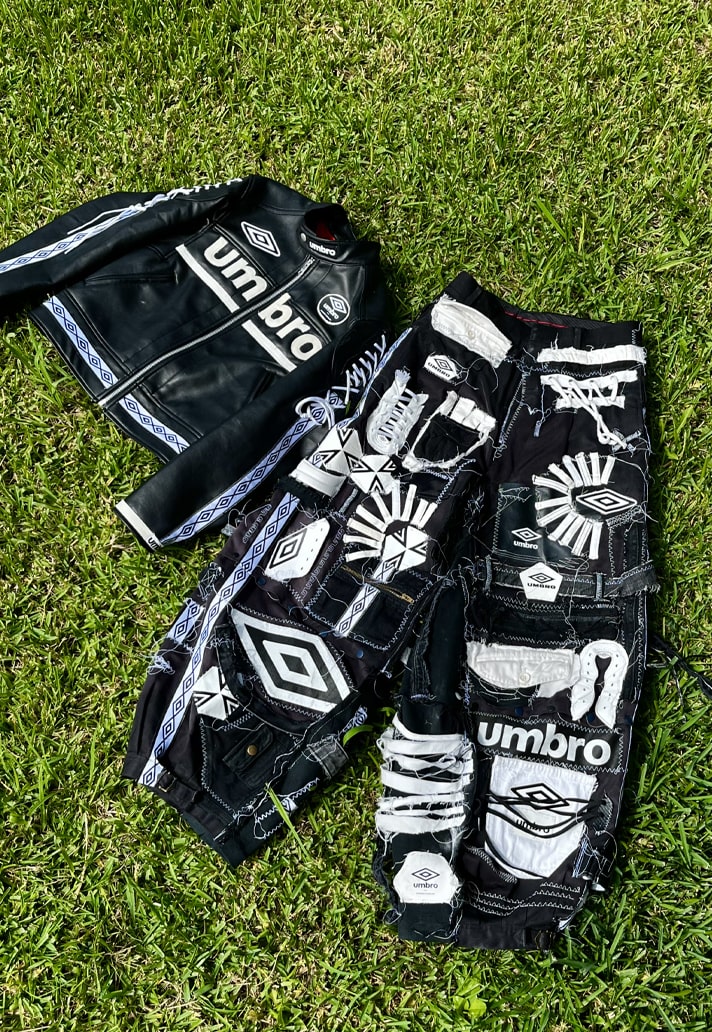 Channelling their own unique style and taking inspiration from motorcycle and racing garments, EGOR used pre-loved Umbro Speciali boots, lifestyle apparel, equipment, and accessories to create a racer outfit. The jacket features handstitched patches and taping along with lace-up details on the sleeves. The pants were constructed using a patchwork design of pieces from boots, balls, and garments.