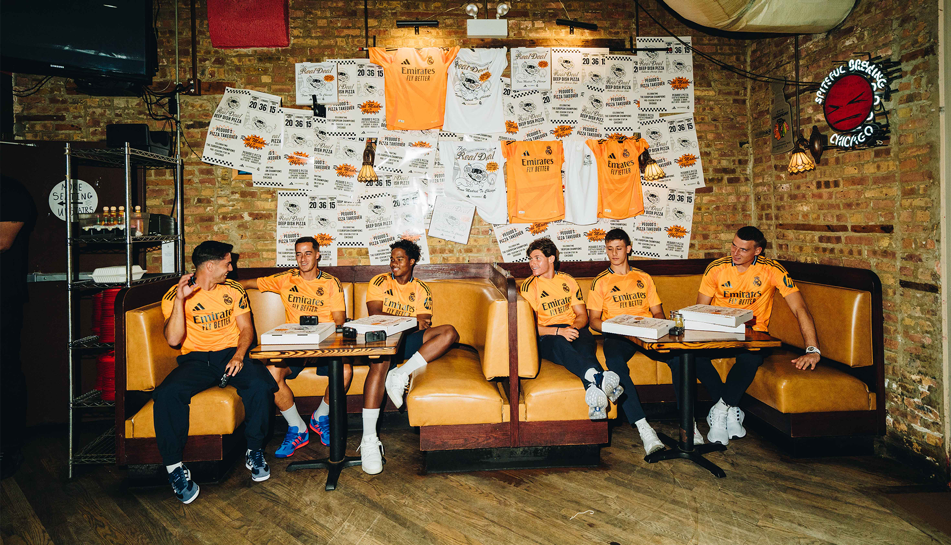 To set the scene and ram home this unique Real Madrid takeover, we designed bespoke menus, staff t-shirts (which almost caused a riot when we gave a couple away), and takeaway boxes to house Chicago’s most awarded pizza. Everything tied into Los Blancos’ new 24/25 Away kit with adidas, the vibrant and soon-to-be-iconic orange jersey that the players donned to make once-in-a-lifetime memories for the fans lucky enough to be there. They sampled the pizza, posed for pictures, and dished out autographs – it was all very wholesome and terrifically designed.