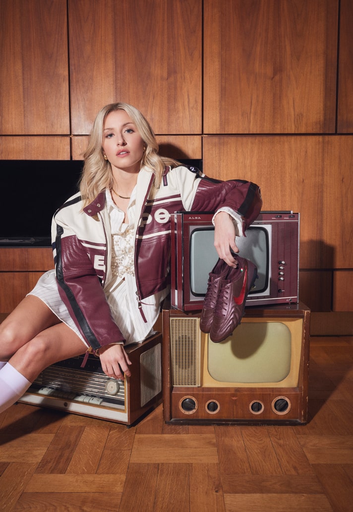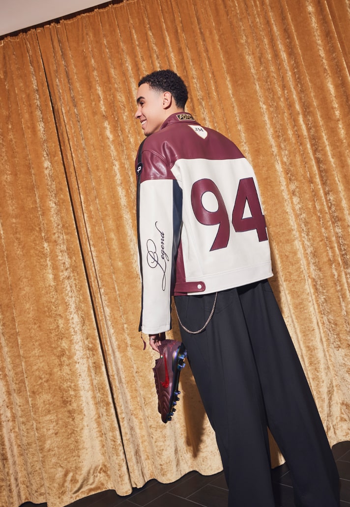 Renowned for her football-inspired haute couture, Bronze—an avid Arsenal fan—drew inspiration from the Tiempo Luxe’s port wine colourway, incorporating key design elements that celebrate both the boot and its wearers. Williamson and Musiala’s squad numbers feature on the shoulders, their initials adorn the arms, and the number “94” emblazons the back, a nod to the first-ever Nike Tiempo.