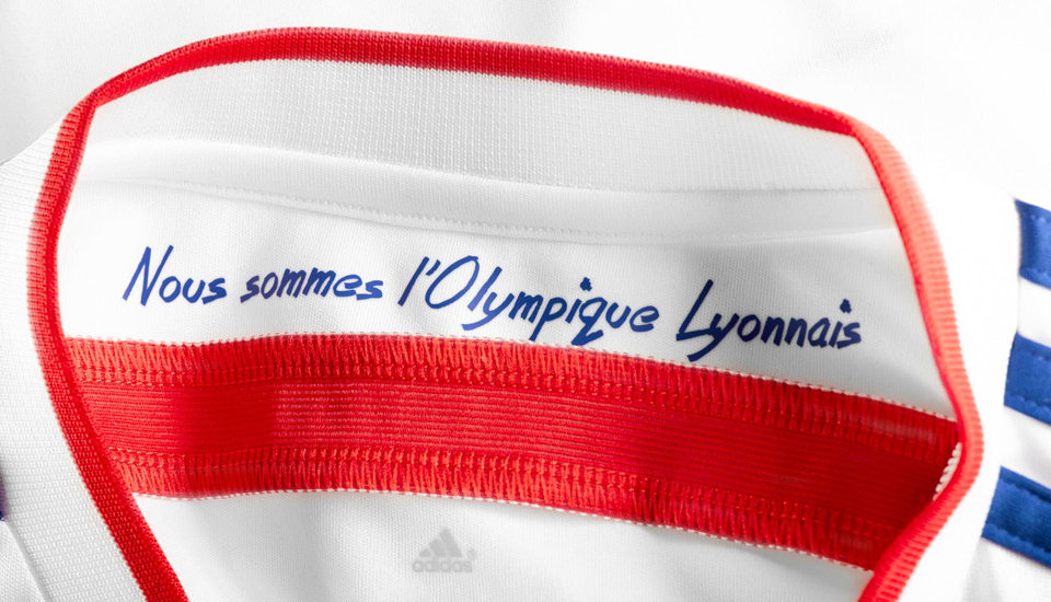 The new shirt has fine blue stripes on the chest giving a simple, dynamic and elegant appearance. Inside the collar, the words "Nous sommes l'Olympique Lyonanais" (We are Olympique Lyonanais) are inscribed to reflect the strong identity shared by both players & supporters of the club.