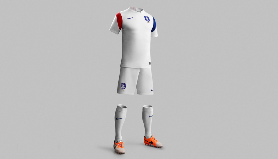 The red and blue interlocking shape from the Taegeuk appears at the top of each sleeve, with the right shoulder red and the left blue, giving the jersey a modern appearance and matching the contours of players’ bodies. The new away shorts and socks are white.