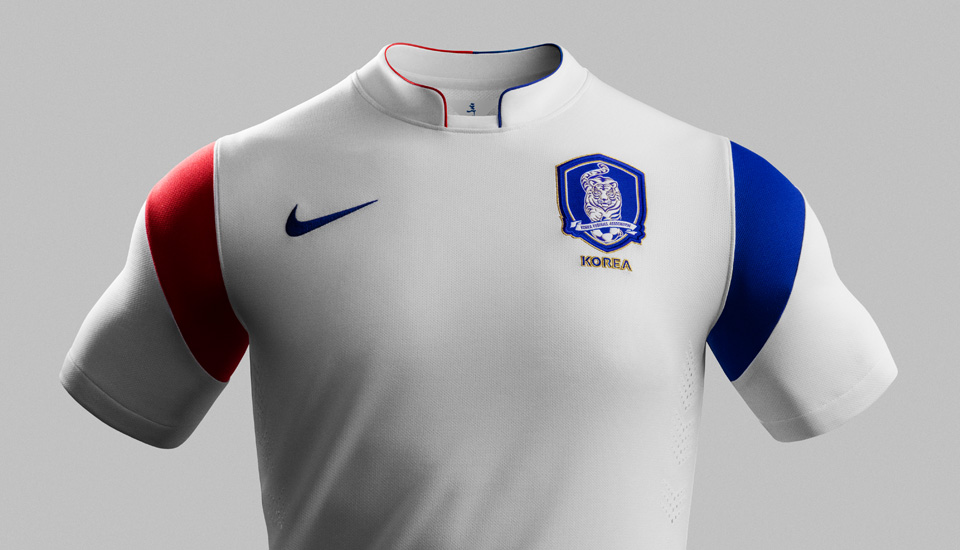 Nike continue to roll out their World Cup kit offerings this time with the unveiling of the Korea national team away strip. With the inclusion of Korea's national flag colours - white, blue and red, the Taegeuk and an Asian inspired collar the new strip embodies Korean national pride.
