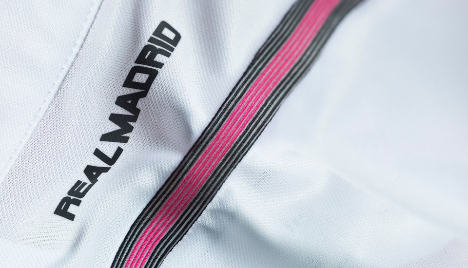 The home kit is what you'd expect. Clean, traditional, white, not many will argue with that. The jersey features a star on the front panel that reflects in the light to recognise the acheivements in the Copa del Rey and Champions League last season, and that's joined by a distinctive new collar. Even the home shirt can't escape the pink factor with bright detailing on the back.