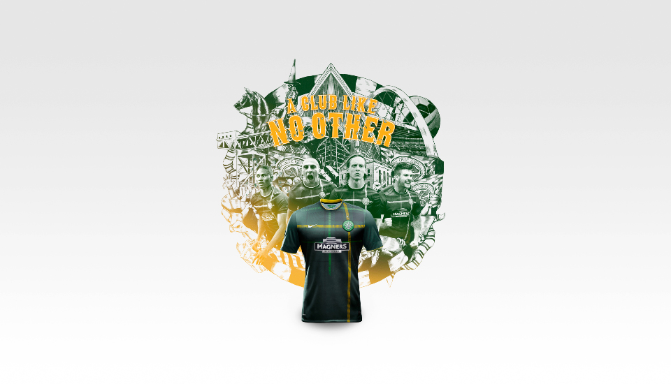 The shirt features gold trim at the neck and sleeves and inside the back of the neck is a green and white pennant tab reflecting Celtic’s famous hoops from their home shirt with the statement: "A club like no other."