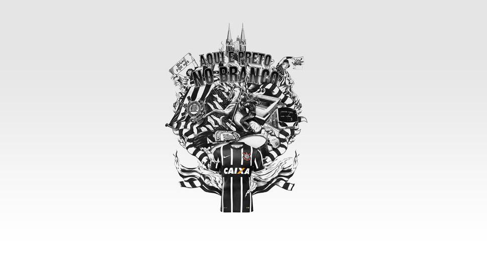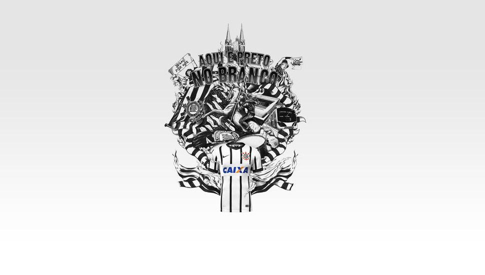 The white home kit features four bold black stripes on the front and two black stripes on both sleeves. Returning for the new season is a v-neck collar design, which has a pennant tab on the inside at the base of the neck featuring an image of Saint George, the club’s patron saint, and the dragon. The shorts are black and the socks are white and, for the first time after many years, bear the same four stripes as the jersey. The club’s acronym can be seen on the back of the socks: SCCP (Sport Club Corinthians Paulista). The away kit mirrors the home kit in design; black with thick white stripes.