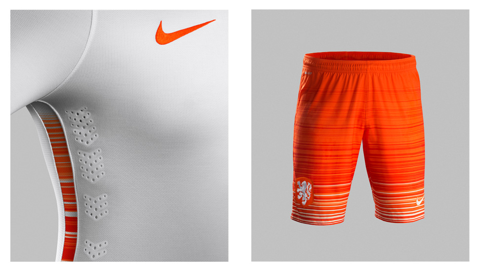 The graphic on the shorts is used to create a strong sense of motion and a blur of color and light when the Dutch players are in action (top image may be slightly exaggerated). The renowned Dutch graphic designer and typographer Wim Crouwel has created a special font for the names and numbers on the kit. The bold and modern font also maintains a retro appearance, reminiscent of the style seen throughout football during the 1970s.