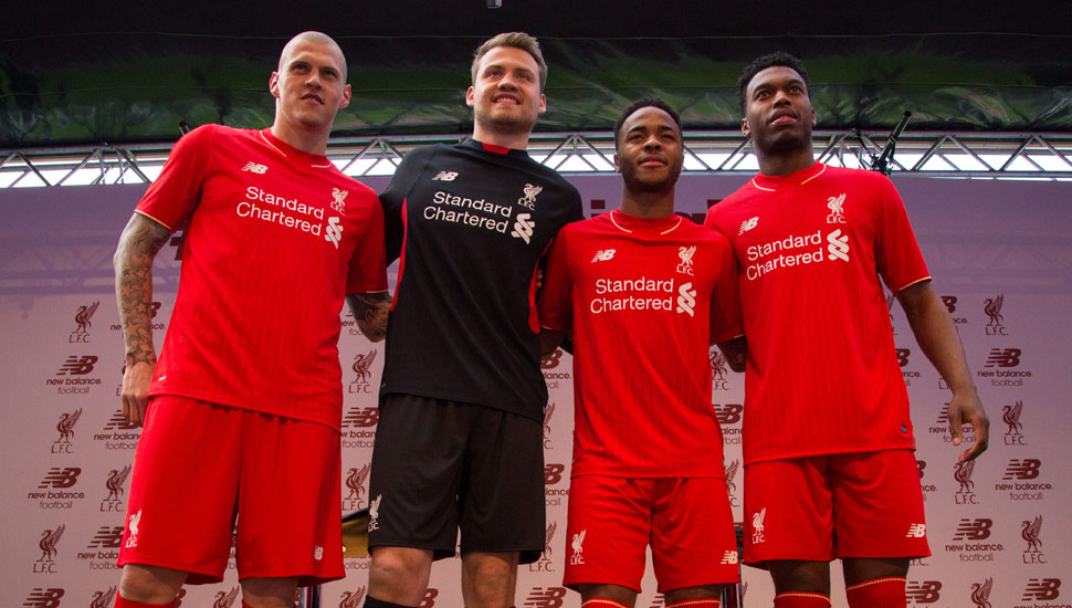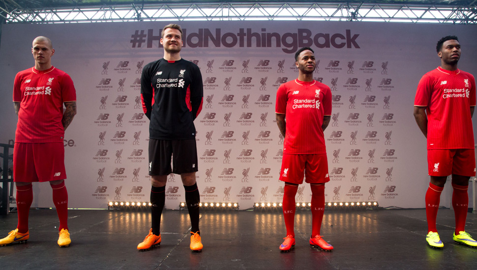 Martin Skrtel, Raheem Sterling, Daniel Sturridge and Simon Mignolet were unveiled, all kitted up in the new Reds strip in front of the Centenary Stand full of expectant Liverpool fans in L4. The post-Gerrard era wil begin with the New Balance logo opposite the famous Liverbird crest as the brand build on the succes of their entrance into the market with a crisp design.
