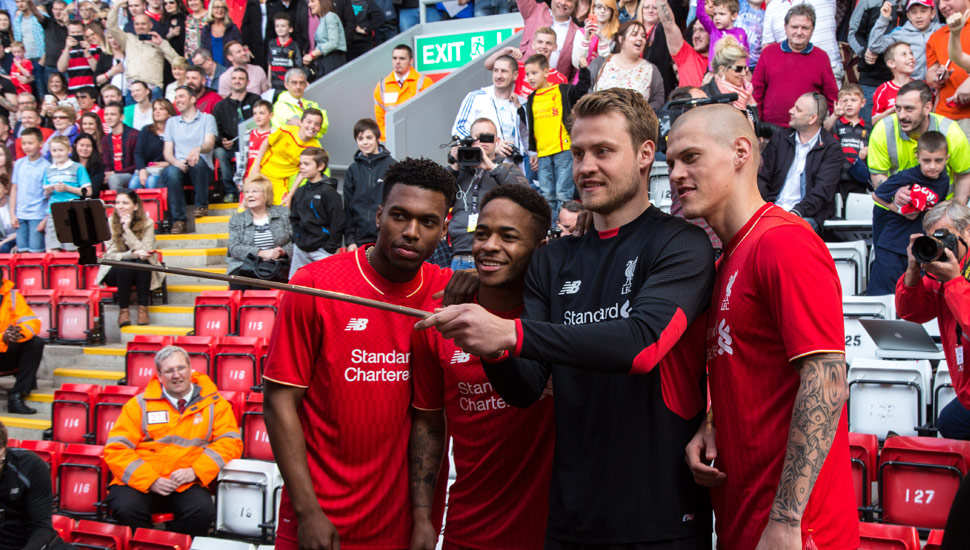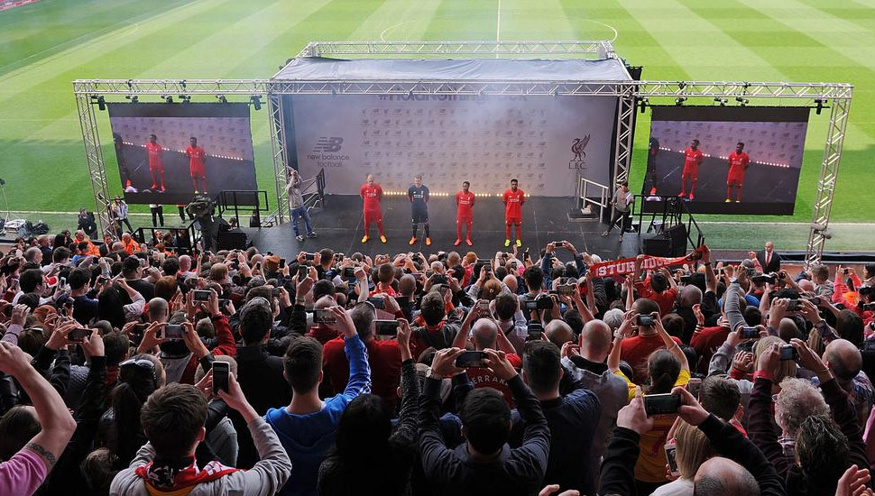 New Balance took over Anfield this afternoon to premiere their first ever Liverpool replica home strip to be worn throughout the 2015/16 season. Bringing the fans as close to the reveal as possible New Balance roped in a quartet of Reds players to walk out at Anfield and streamed the whole launch live.