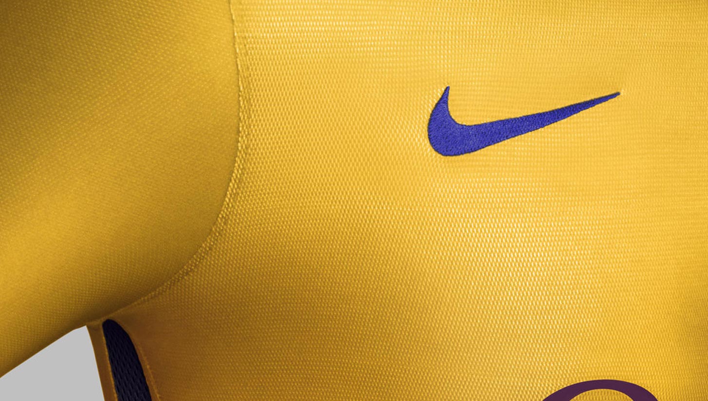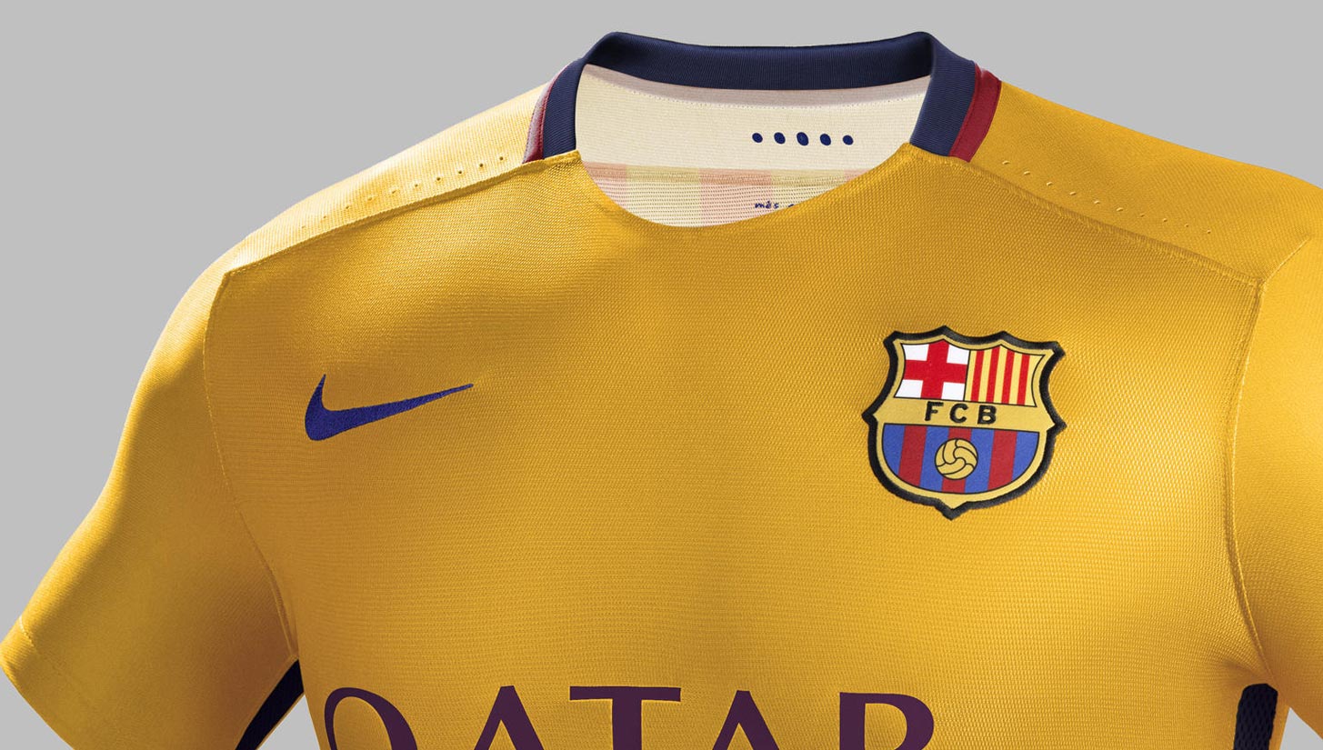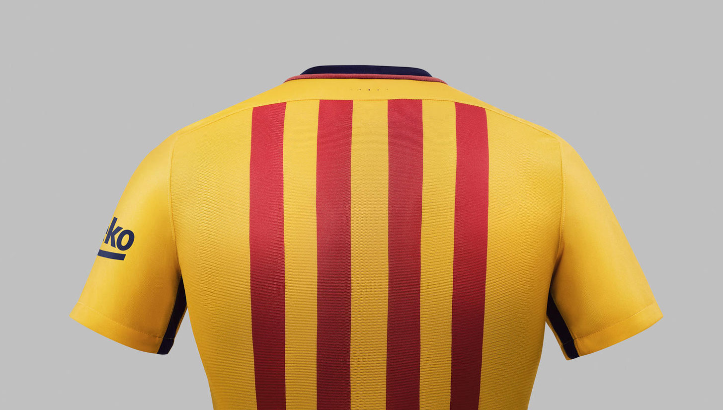 The new away shirt is predominately golden yellow, a hue long associated with Catalan unity. On the back, four vertical red stripes on a golden yellow background run from the shoulders to the hem. This design is inspired in the way that FC Barcelona fans wear the Senyera around their necks as a cape in celebration and support.