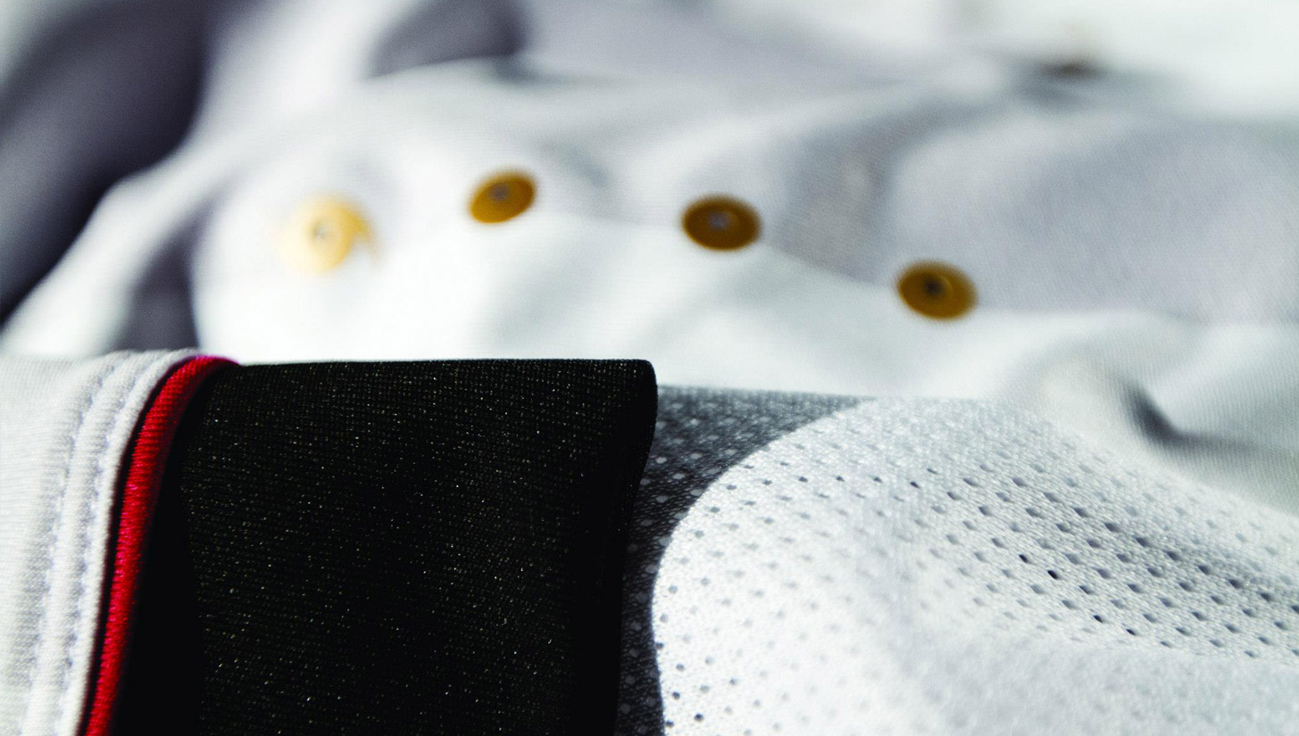 Unique, though modern in design the home kit carries the traditional bold red and white stripes which is washed throughout the shirt, down the sleeves and onto the back. A 'V' shaped collar that matches the cuffs of the sleeves, the solid black brings the home shirt together as a sophisticated package.