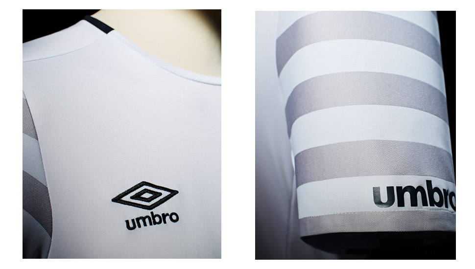 Joining the Everton 2015/16 Home Shirt the sleek away strip is predominantly white with eye-catching grey graphic detailing on the sleeves and side panel areas. That contrasting graphic continues onto the black shorts and white/grey hooped socks for another beaut of a design from Umbro who are bossing the bespoke replica game this pre-season.