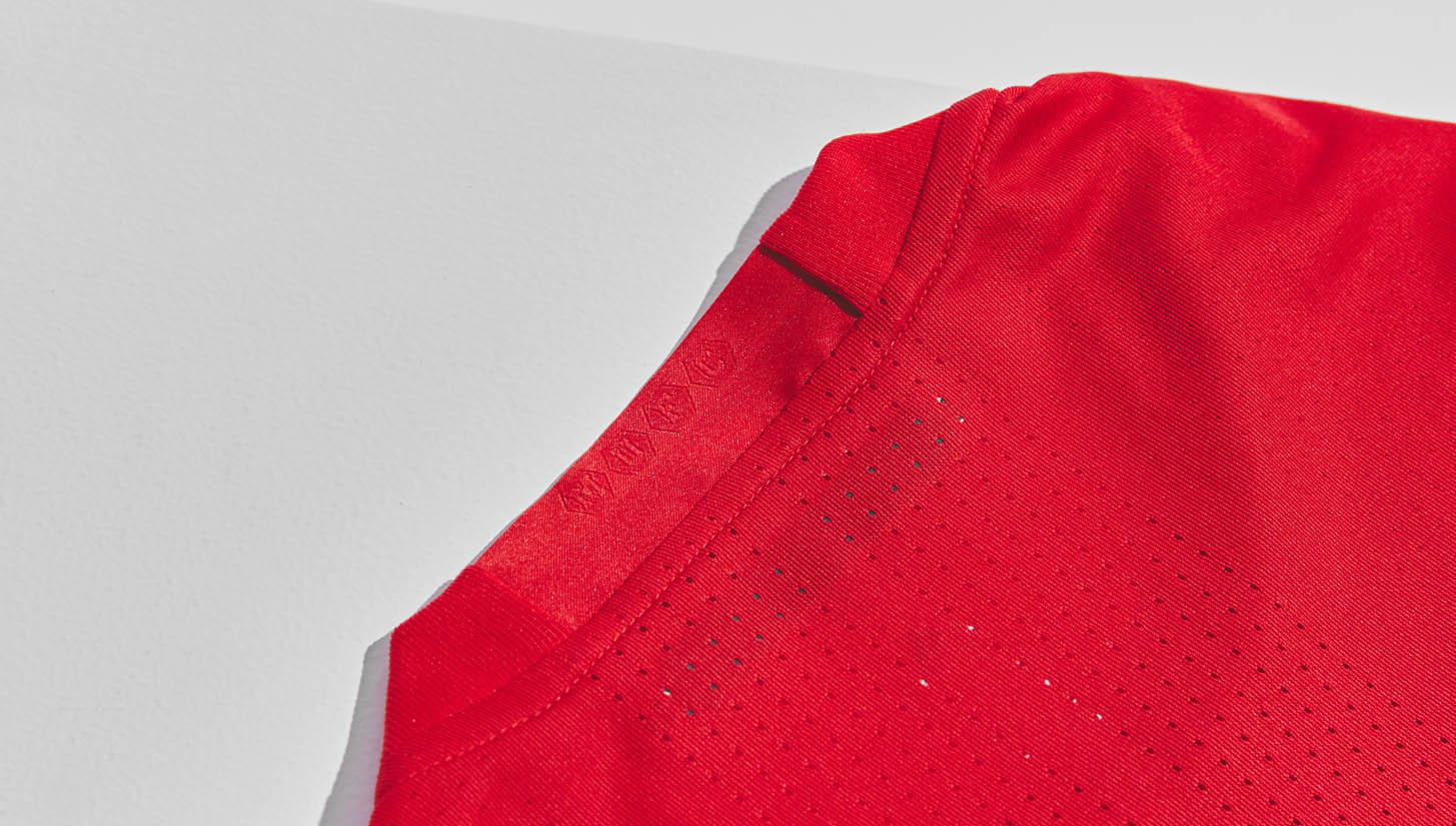 In the second year of the United shirt donning the Three Stripes, adidas have gone right back to the start for the design of the home strip, with the two tone red split evoking the two-tone Newton Heath kit of 1878. The official coat of arms for the City of Manchester was the basis behind the idea for the honeycomb graphic that knits together the two red block designs on the shirt.