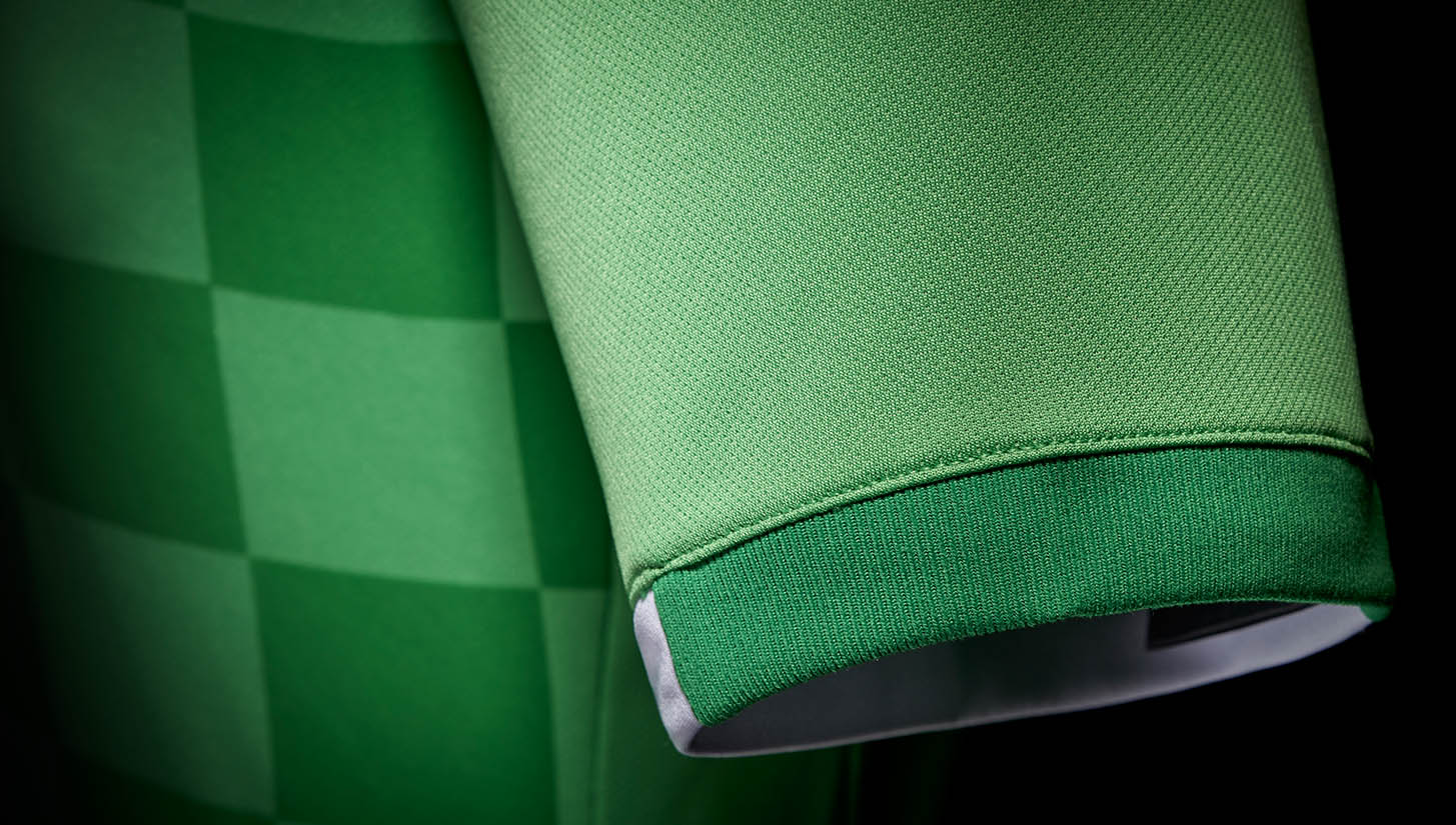 To be worn on travels across Europe, the powerful green base is washed with a checkerboard design that comes from the flag of North Brabant - of which, Eindhoven is the largest city. Keeping traditions strong, the coordinates of the Philips Stadion are striking in the neck line. The thought being that those wearing the shirt can take a slice of the stadium with them as they journey through European cities.