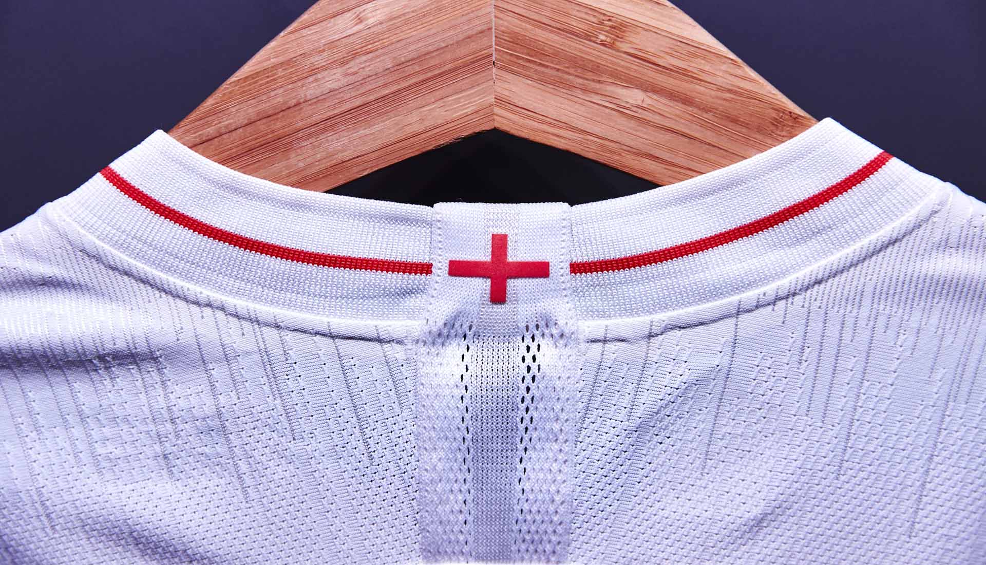 A classic look is adopted by Nike, as the white shirt with red trimming is met with blue shorts, and white socks. A modern rib collar is backed by a small St. George’s Cross and a blue Swoosh on the chest that complements the famous Three Lions crest in its traditional colors. A lonely star heralding the 1966 success sits above the crest in silver.