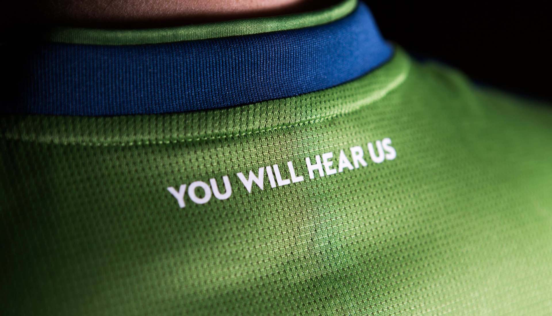 Sounders players Kelvin Leerdam and Stefan Frei took up kit modelling responsibilities, with goalkeeper Will Bruin showcasing the new GK strip. Further details are on the neckline, where the phrase "You Will Hear Us" is featured, the motto of fan site SounderAtHeart.com, which is itself a snippet from the full verse paying tribute to Seattle's hordes of noisy fans: Nos audietis in somniis/nos audietis in alto ("You will hear us in your sleep/You will hear us from the deep").
