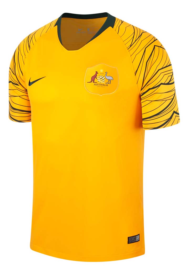 Gold from top to bottom, the 2018 Australia home kit is a significant change from the traditional combination of a gold shirt with green shorts. Those shoulders and sleeves providing the statement look for Oz.