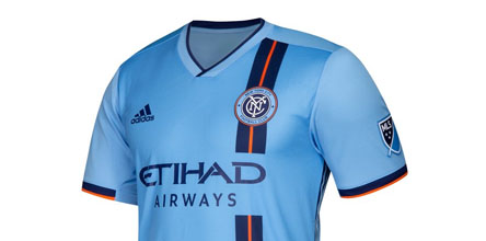 Arriving in the traditional sky blue colours of the club, the jersey features a pigeon mosaic on the jock tag, honouring the unofficial bird of the city, a vertical stripe in the colours of the New York City flag, and the flag itself featured on the back neck. Done.