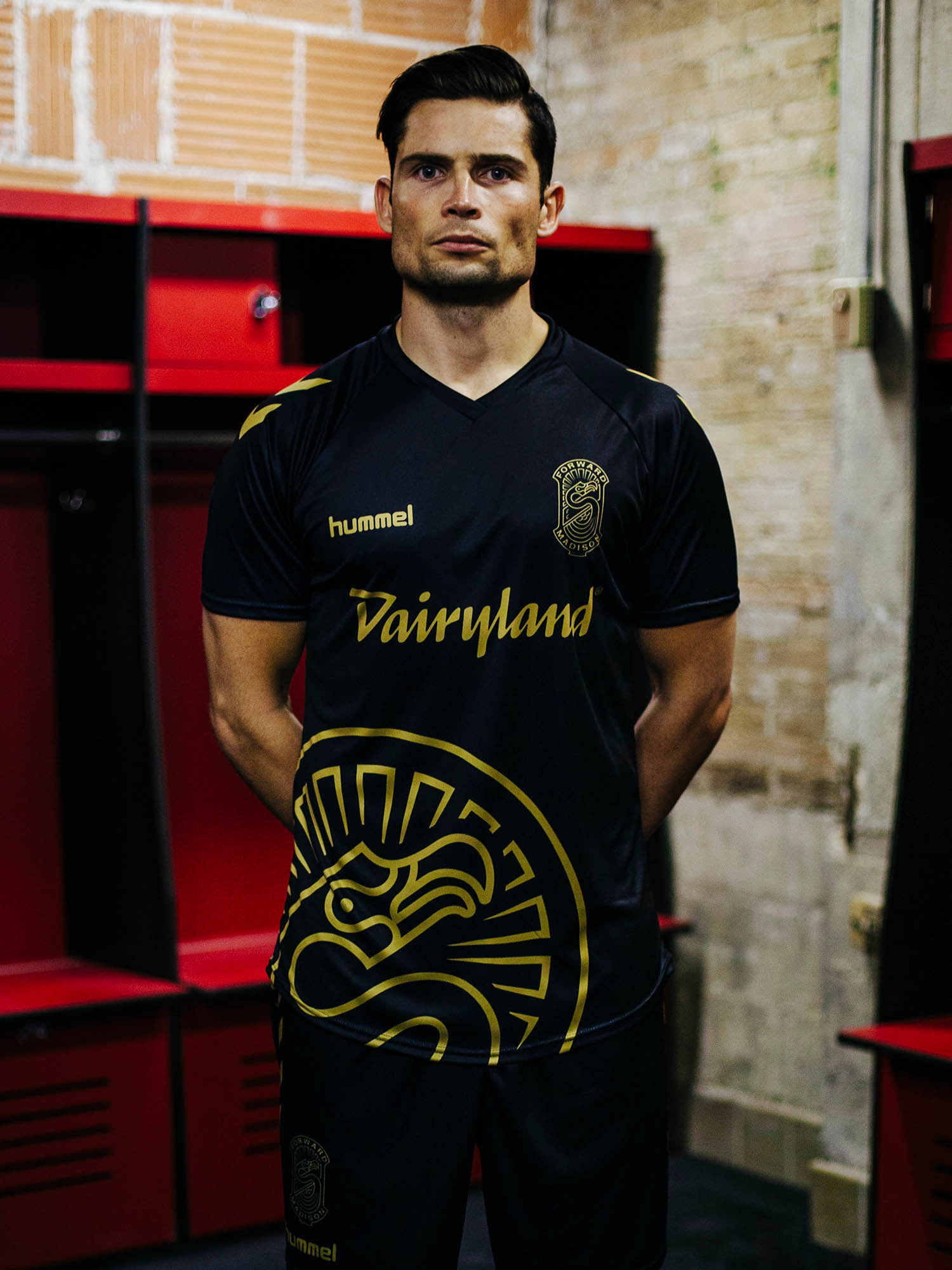 The away jersey is white, with a sash outlined in pink. Its primary feature is the pattern of pink flamingos that spreads across the kit. The words “Loud. Vibrant. Unwavering” are printed inside the collar in reference to the motto of The Flock, FMFC’s independent supporters’ association. In contrast to the bright looks of the home and away jerseys, the keeper's kit is black with gold accents.