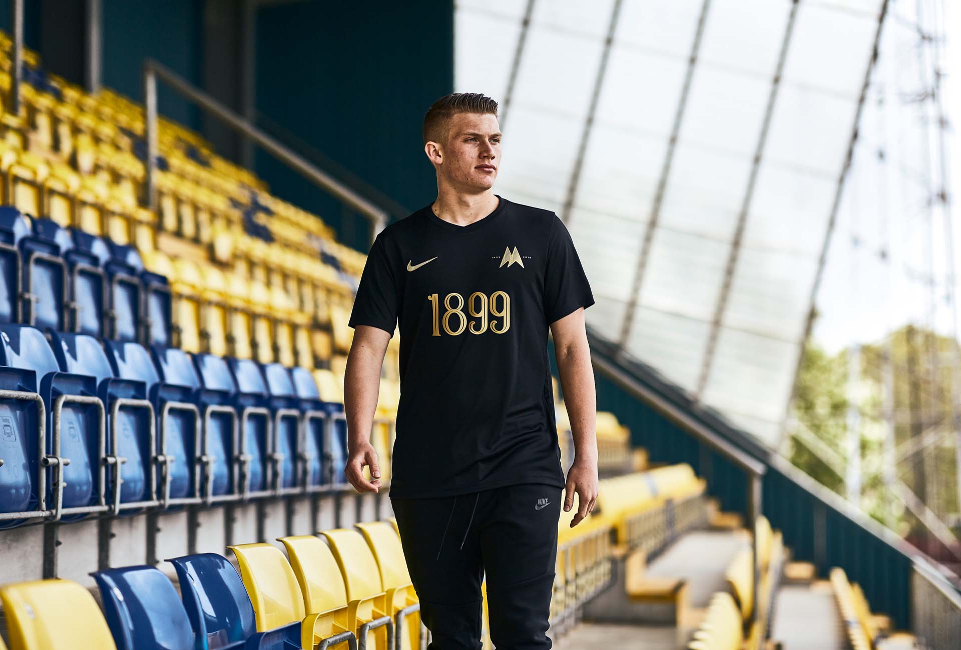 The famous crest has been given a redo, stripping it back to offer a minimalist version that’s in keeping with the rest of the shirt, with the anniversary years appearing on either side – 1899 on the left, 2019 on the right. The “1899” that appears in place of a traditional shirt sponsor has been styled to resemble the traditional curly font seen on the classic 67-68 shirt for even deeper ties to the club’s heritage.