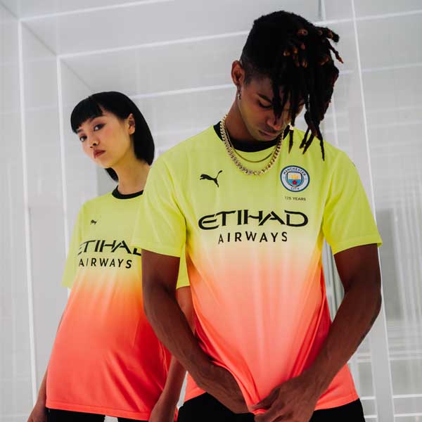 Where the home shirt is all about the industrial roots of the city, the away shirt celebrates the cultural side of things, taking influence from the city’s “Madchester” years and specifically former nightclub, The Hacienda, which was once an epicentre for emerging music, bands, DJs, and artists. The black base pops with several colours throughout, with the yellow stripes on the shoulder being a direct reference to the Hacienda’s iconic graphic identity, while the additional peach and City blue flashes on the sleeve cuffs create a colourful finish to City’s secondary look.
