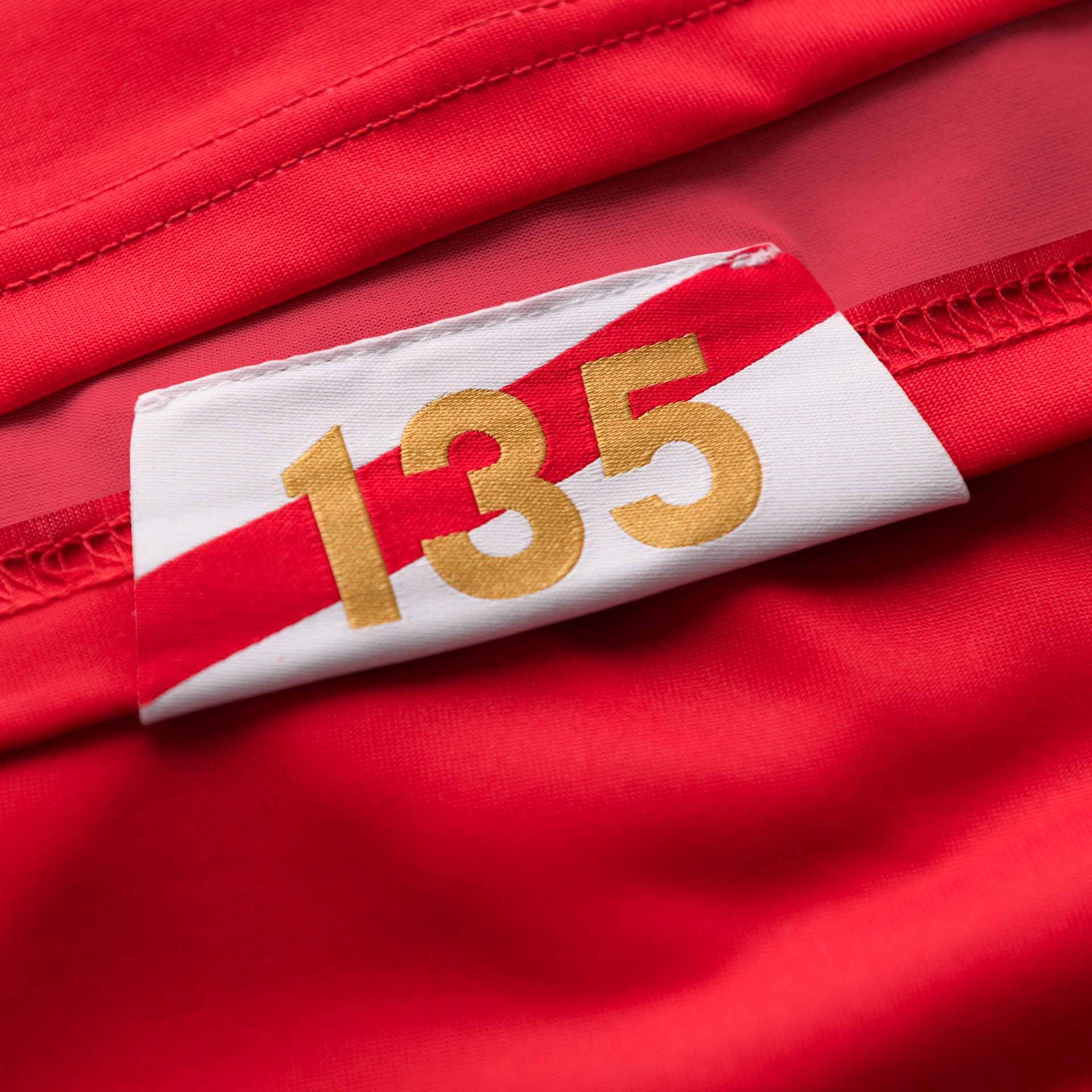 Subtle details are then incorporated throughout the design of both, including the club motto of “We March On!”, which appears in the neckline and on a tab on the hem. The latter is also joined on the hem by a “135” call out, which sits on a sash effect background.