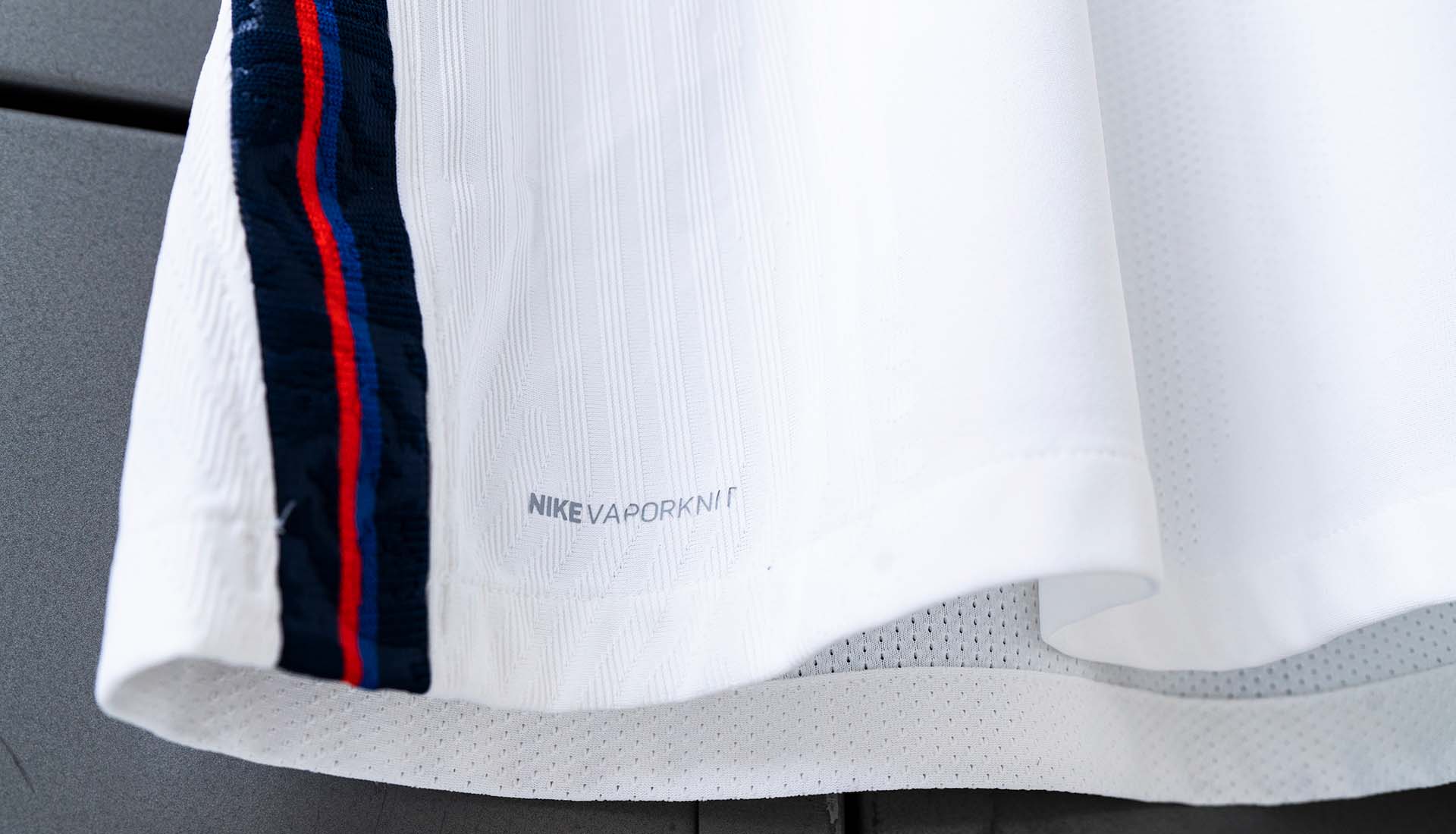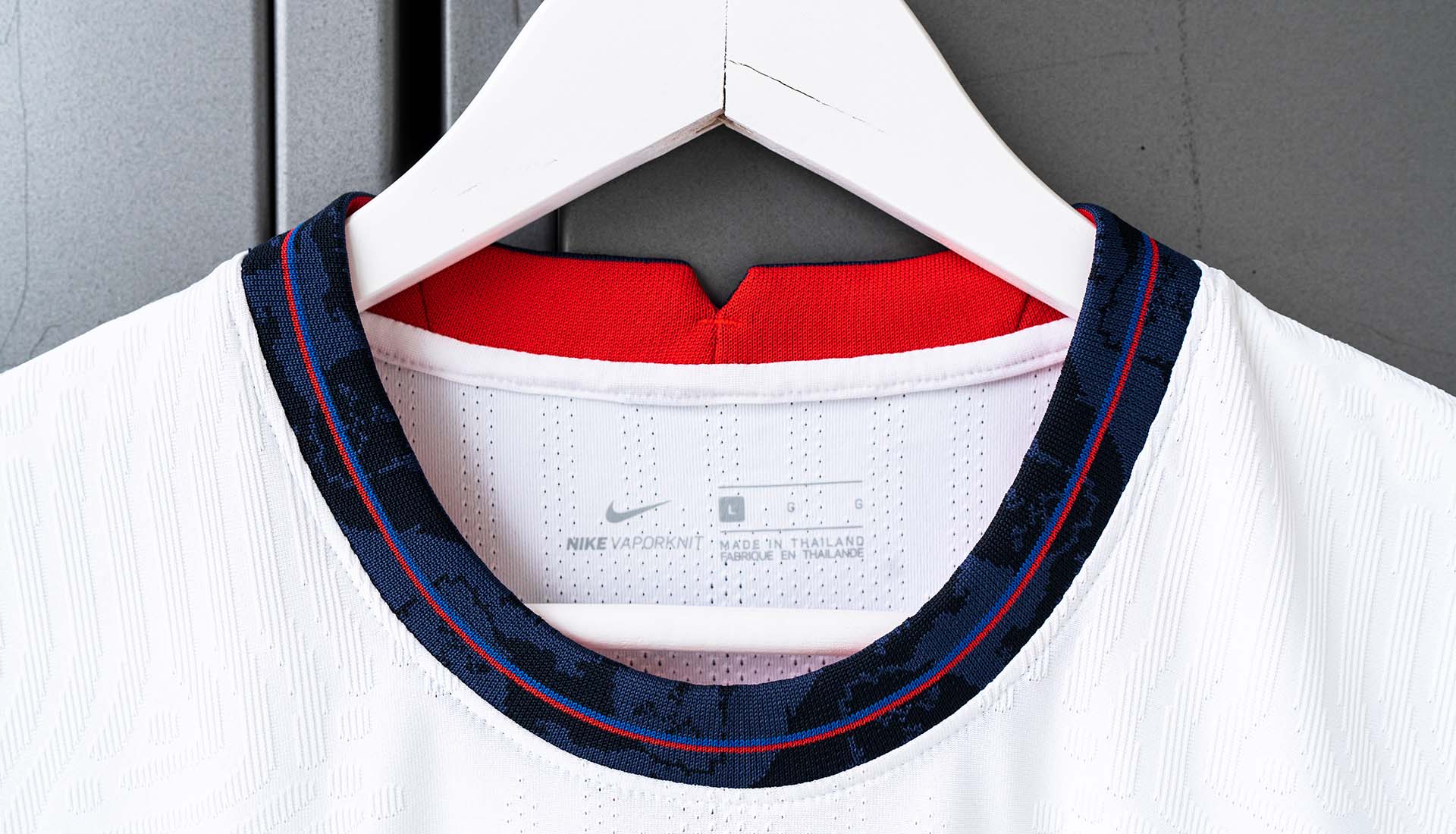 England’s minimalist white home shirt features a central crest and Nike Swoosh with a dark blue crew neck and side stripes. The symmetry of the design will be further bolstered by centralised squad numbers, while both the collar and the stripes are embossed with the distinctive ‘community of lions’ graphic.