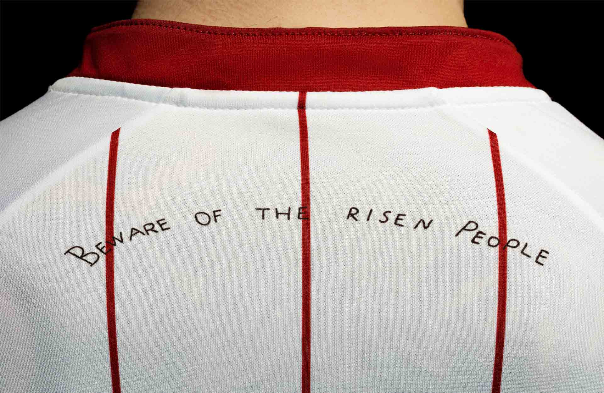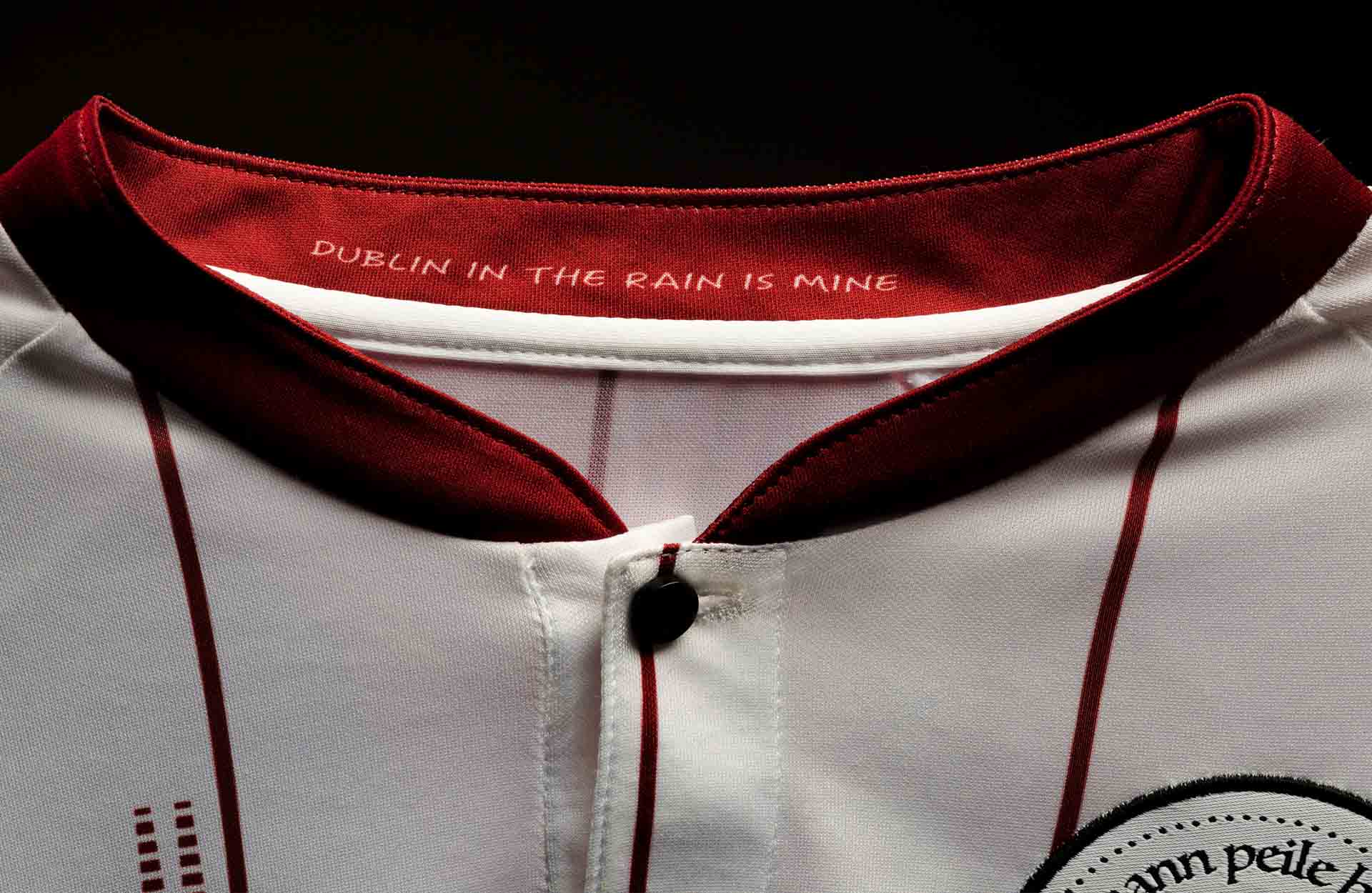 The jersey pays homage to Dublin and Ireland in its design, which features Celtic knotwork, the Poolbeg towers, Grattan Bridge lamps, the 'Dublin in the rain is mine' Fontaines lyric, and Patrick Pearse's quote 'Beware of the Risen People' from the wall of Kilmainham Gaol. This quote embodies the human spirit and that there is hope for everyone even when at their lowest ebb. 15% of the jersey profits will go to Focus Ireland.