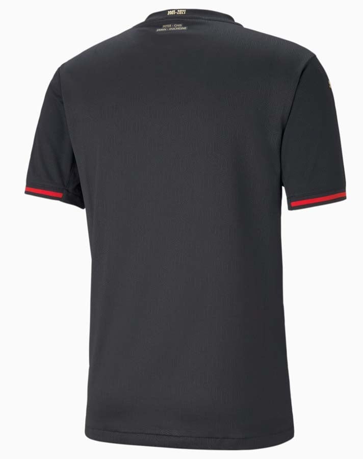 The shirt features an all-black base with a vertical red stripe, reminiscent of the club's centennial jersey, as well as an SRFC anniversary crest and a gold-coloured PUMA logo. Rounding off the design, the back of the shirt sees the text 1901-2021 embroidered onto the collar, while founding members and early players Duchesne, Jamin, Peter, and Ghis are honored by having their names printed on the upper back just below it.