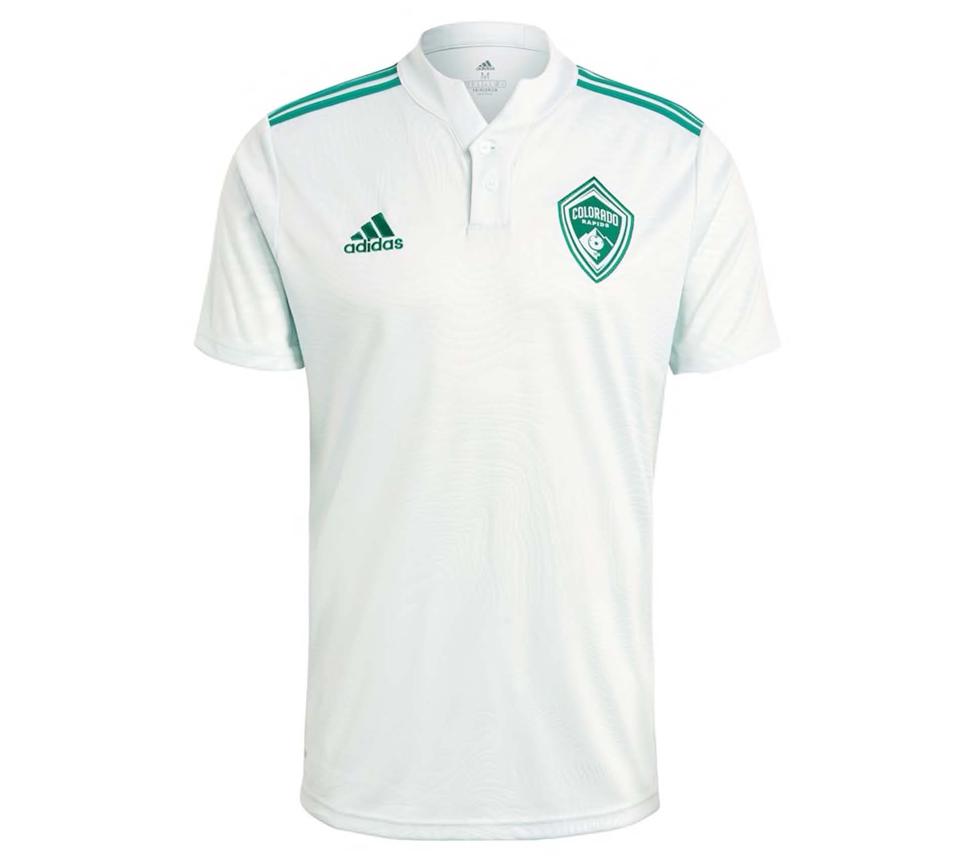 Now, the Colorado Rapids 'Class 5' secondary jersey may look like another whiteout kit but it's actually listed as "Dash Green/Bold Green". The design pays tribute to the natural landscape that the club calls home (yes, they live in the snowy mountains) but within that light green, if you look really close, there's topographical maps of Colorado’s six “14ers,” meaning mountains that rise above 14,000 feet. Is it green? Looks white to us. Might need to get our eyes checked...