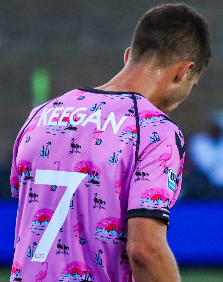 The ‘Beach’ side of the kit features hand-drawn art of the Madison skyline, along with multiple pink flamingos balancing on soccer balls and smaller navy flamingos. The ‘Club’ side features a pattern of hot pink flamingos overlaid on a slick black background, paying homage to a design that is foundational to the club.