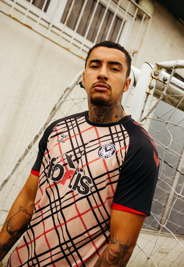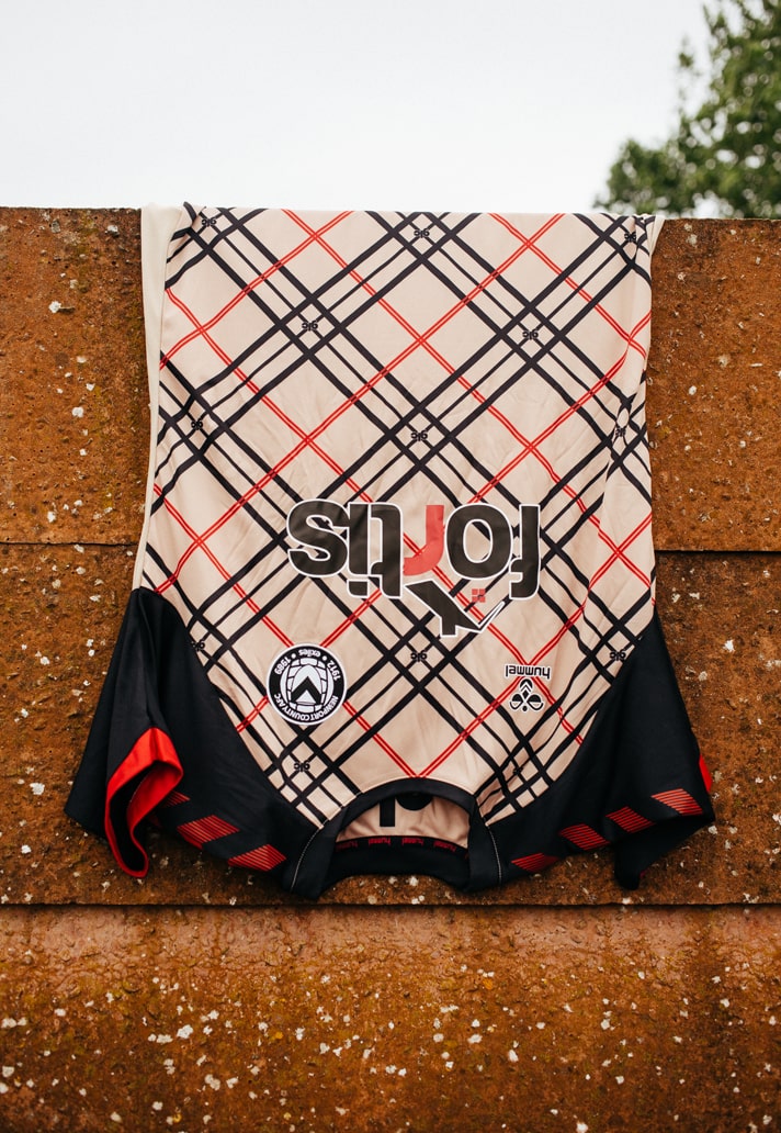 Featuring a two-colour heritage check with entwined GLC logos, the design is predominantly sesame and consists of a check pattern, which is made up of red and black lines across the front of the shirt. The club crest has also been modified to a blacked-out special edition to blend in with the rest of the shirt.