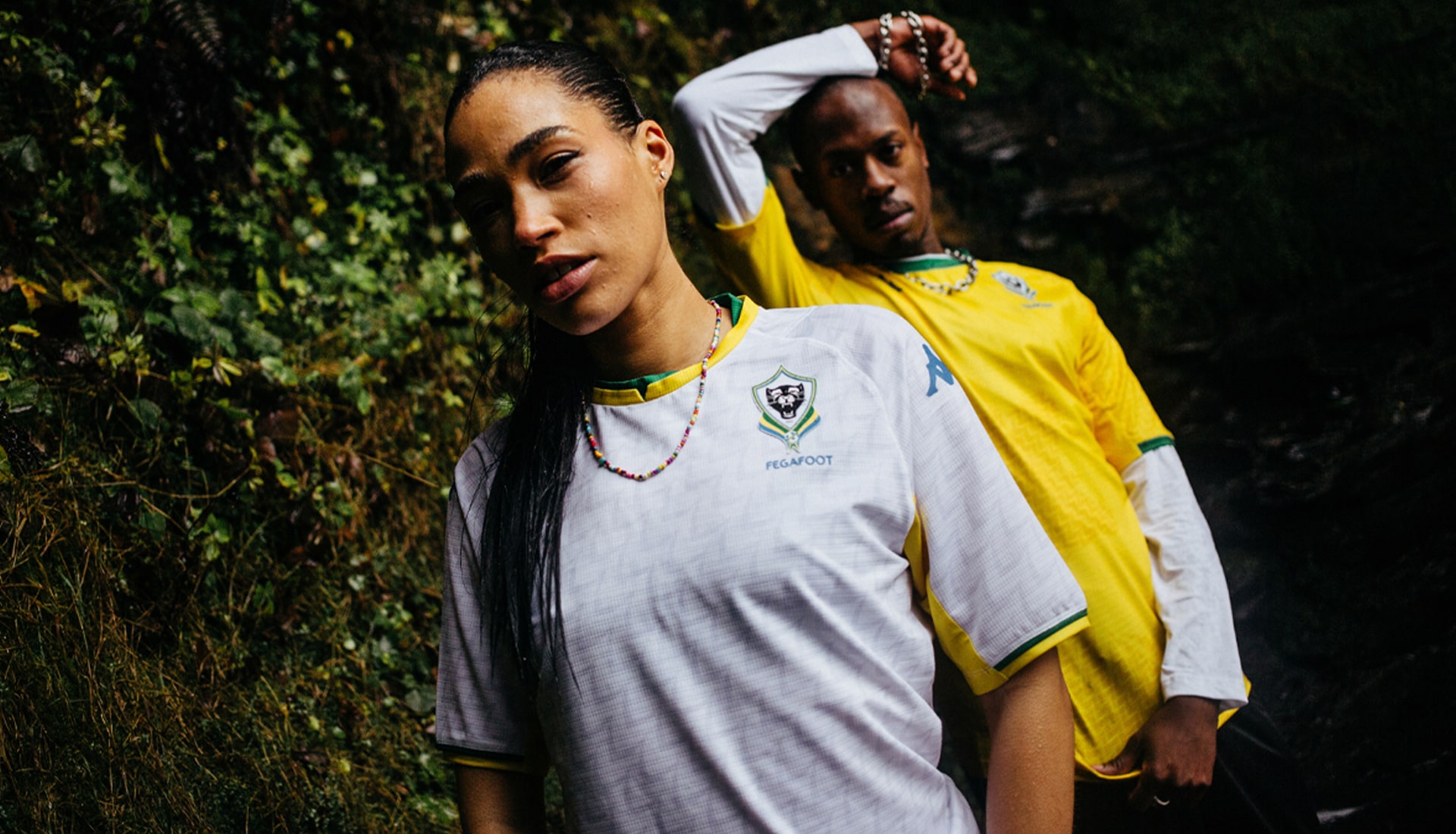 The Away jersey is predominantly white and has yellow contrasting under arm panels. The same graphic pattern that makes up the panther on the home shirt is used throughout the away and also on the third shirt. The Third jersey itself is a nod to the Gabonese flag, which symbolises the forest, the sun and the sea, and it features on the front of the jersey through the diagonal line.