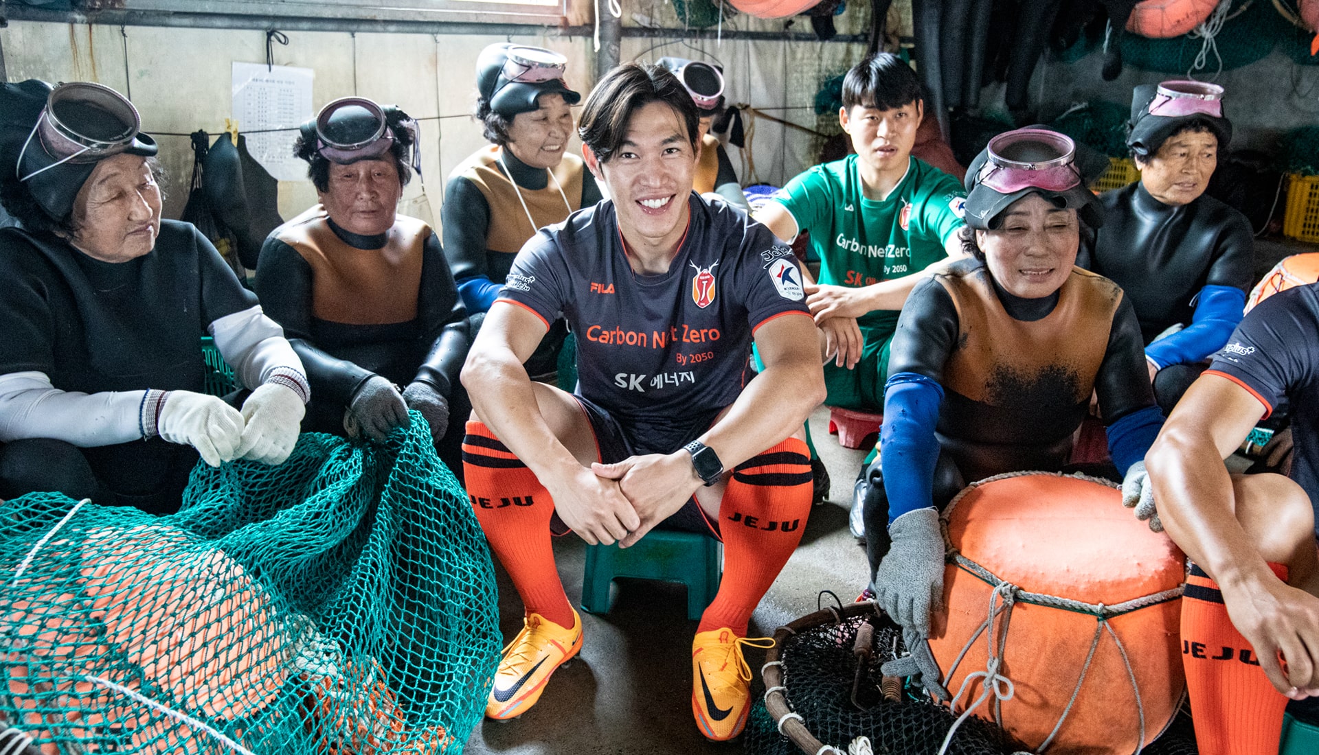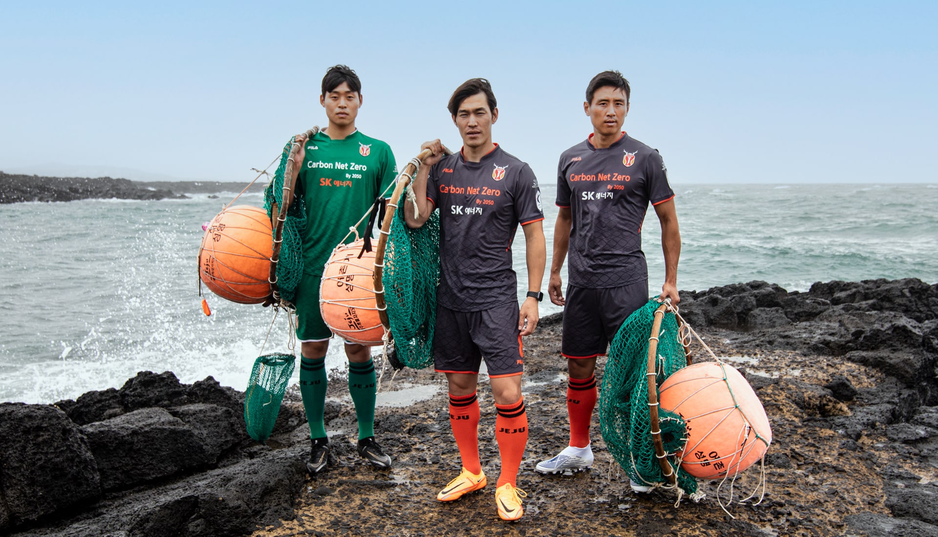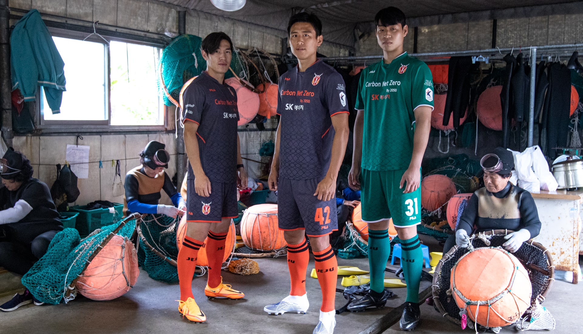 The ‘Jeju Haenyeo’ shirt sees a raised collar in a nod to the wetsuits that the female divers wear. The dark grey base is a further acknowledgement of the female diver's uniform, while the orange, the symbolic colour of Jeju, pops through collar, cuffs and sponsor. There’s then a sublimated pattern of the “Tewak" net, used by haenyeo when working in the water. Jeju fans collected 32,153 bottles, far exceeding the target of 10,000.