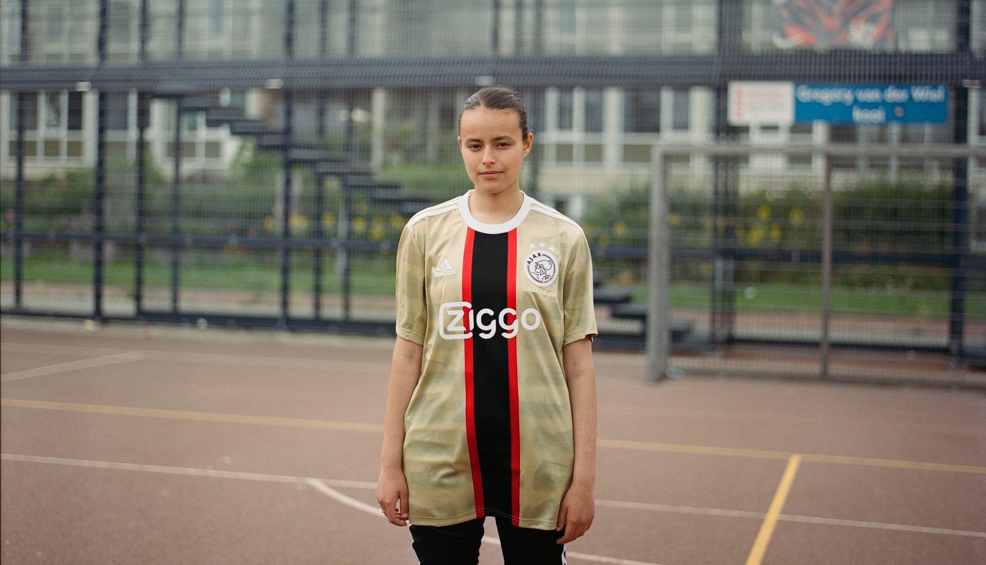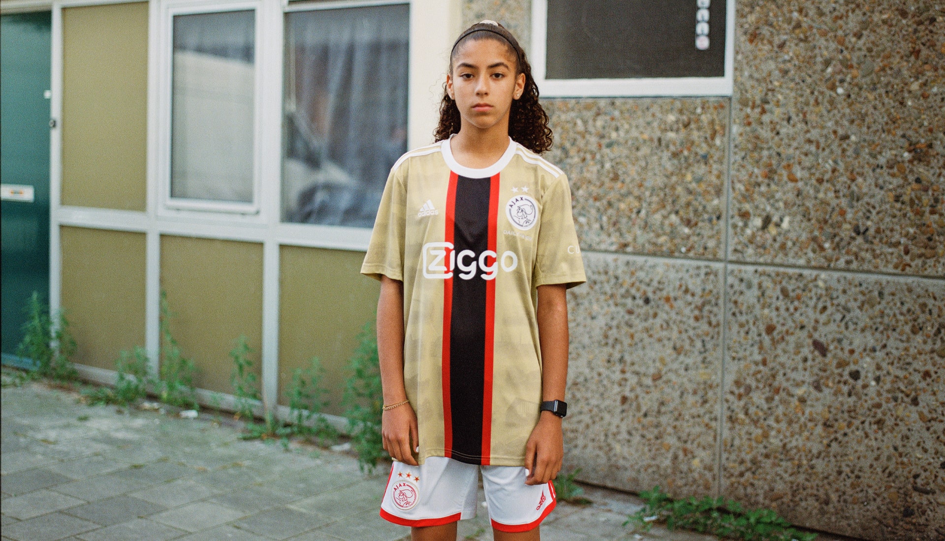 The new kit sees a light golden base joined by that black-and-red stripe down the centre to create a look that is reminiscent of the classic home kit design. The accents are white, utilised on the collar, Three Stripe branding on the shoulders and chest, sponsor, and club crest. But there's more than meets the eye about this design. A closer look reveals smoky black watermarks of nine of Amsterdam’s most prominent street football courts.