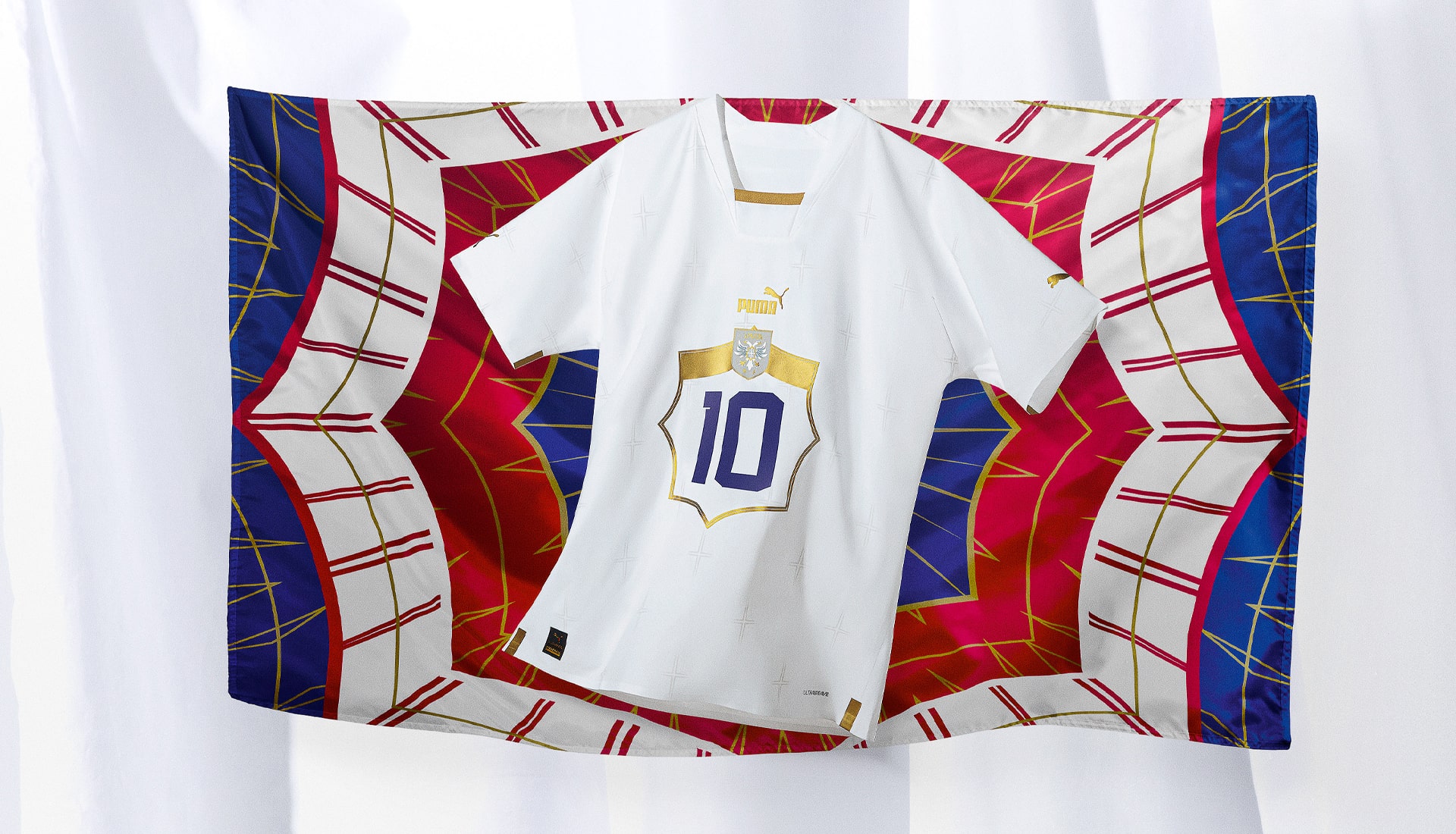 The white 2022 Serbia Away jersey features gold accents and bespoke front panel graphics to celebrate Serbia’s footballing heritage. Central to the crest is a stylized reference to the coat of arms found at the Prince Mihailo Monument in Belgrade. Established in 1882, at the founding of the kingdom of Serbia, the coat of arms is incorporated into the crest to unite the team and the fans.